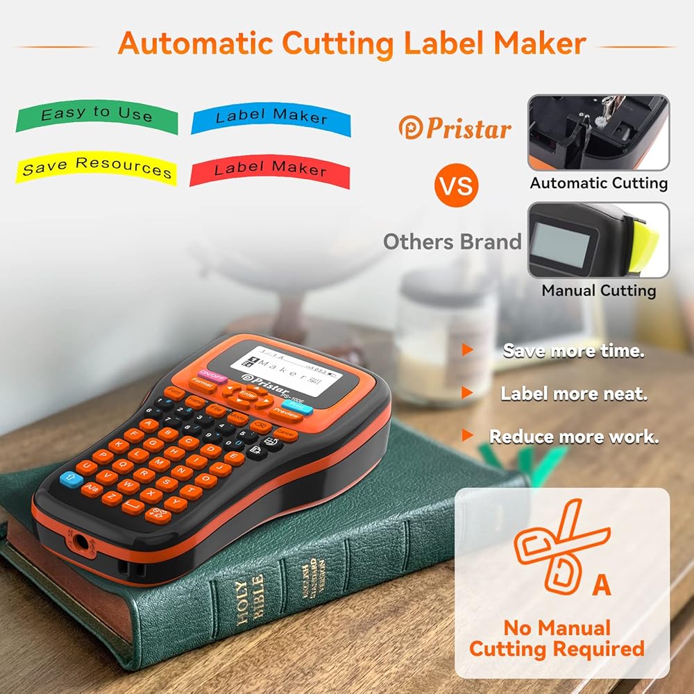 آلة صنع الملصقات Pristar PS-100E مع شريط واحد، صانع ملصقات محمول محمول مقطوع تلقائيًا، طباعة نقل حراري، طابعة ملصقات قابلة لإعادة الشحن مع لوحة مفاتيح للمكتب/المنزل/المدرسة، برتقالي