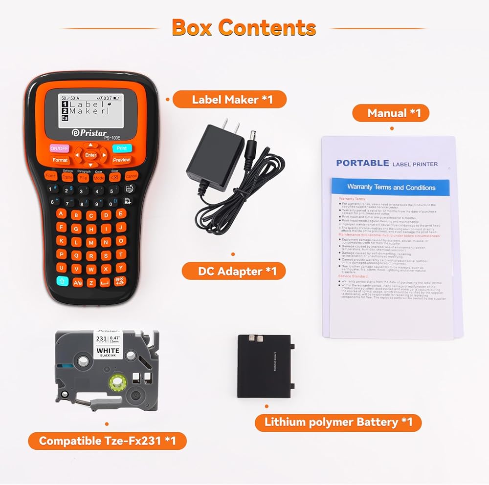 محتويات العبوة - 1 × صانع ملصقات Pristar PS100E؛ 1 × متوافق مع شريط الملصقات TZe-FX231 مقاس 12 مم 0.47 بوصة؛ 1 × محول تيار مستمر؛ 1 × بطارية ليثيوم بوليمر قابلة لإعادة الشحن و1 × دليل المستخدم؛ يمكن تشغيل ملصق Pristar PS-100E بواسطة بطارية جافة AAA رقم 7 (تحتاج إلى 6 عبوات، غير مدرجة).تستخدم على نطاق واسع في المنزل والمدرسة والمكاتب والصناعات والمنظمات كبديل لطباعة ملصقات مختلفة لأي عنصر في أي مكان.
