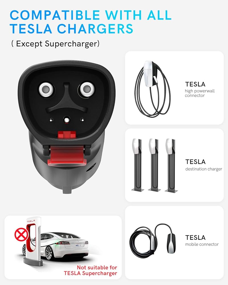 【التوافق: تم تصميم محول Tesla إلى J1772 خصيصًا لتوصيل شاحن J1772 القياسي EV وشاحن Tesla. يمكن استخدام محول تيسلا هذا مع جميع شواحن تيسلا (موصل الحائط، وموصل تيسلا المحمول وشاحن وجهة تيسلا) باستثناء شاحن تيسلا الفائق. وهذا يضمن أنه يمكنك بسهولة شحن سيارتك J1772 باستخدام محطة شحن Tesla.