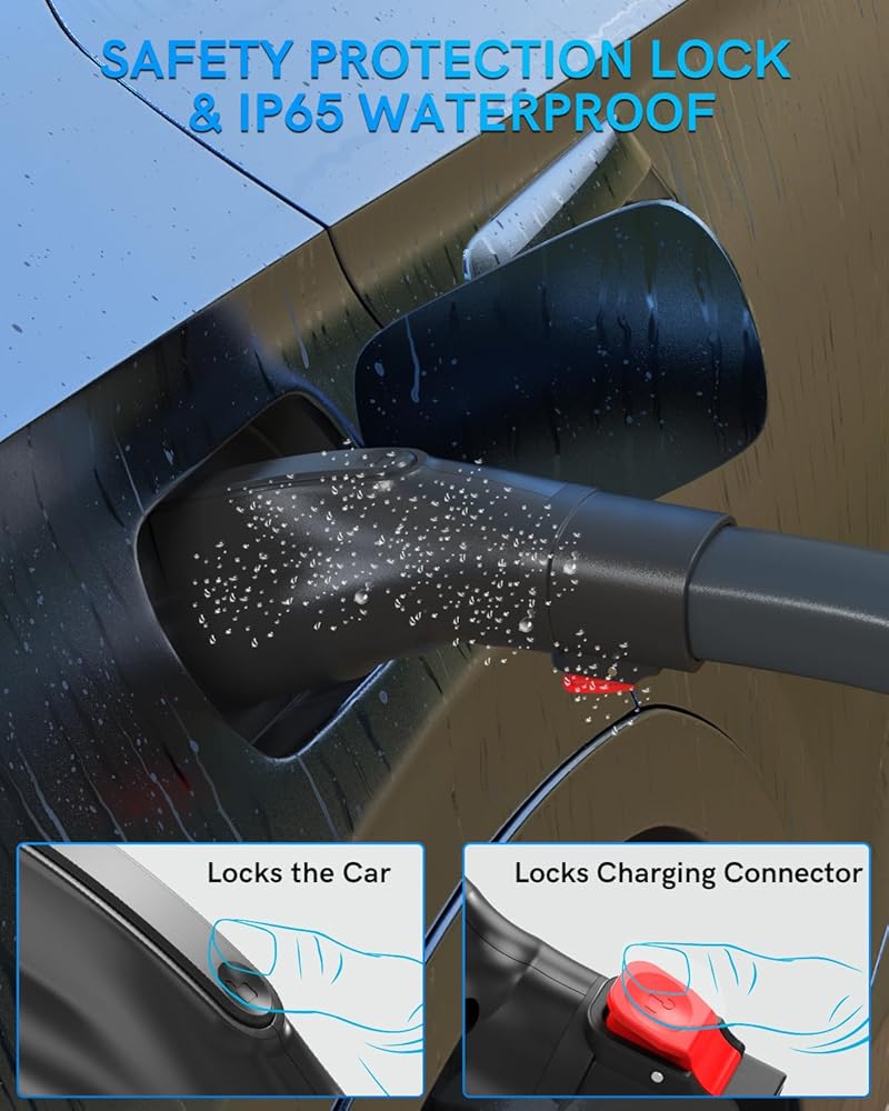 【أمان فائق】- يأتي محول الشحن Tesla إلى J1772 مع حماية مقاومة للماء IP65. كما يتميز أيضًا بقفل أمان لضمان الشحن الآمن بأسرع سرعة ممكنة.