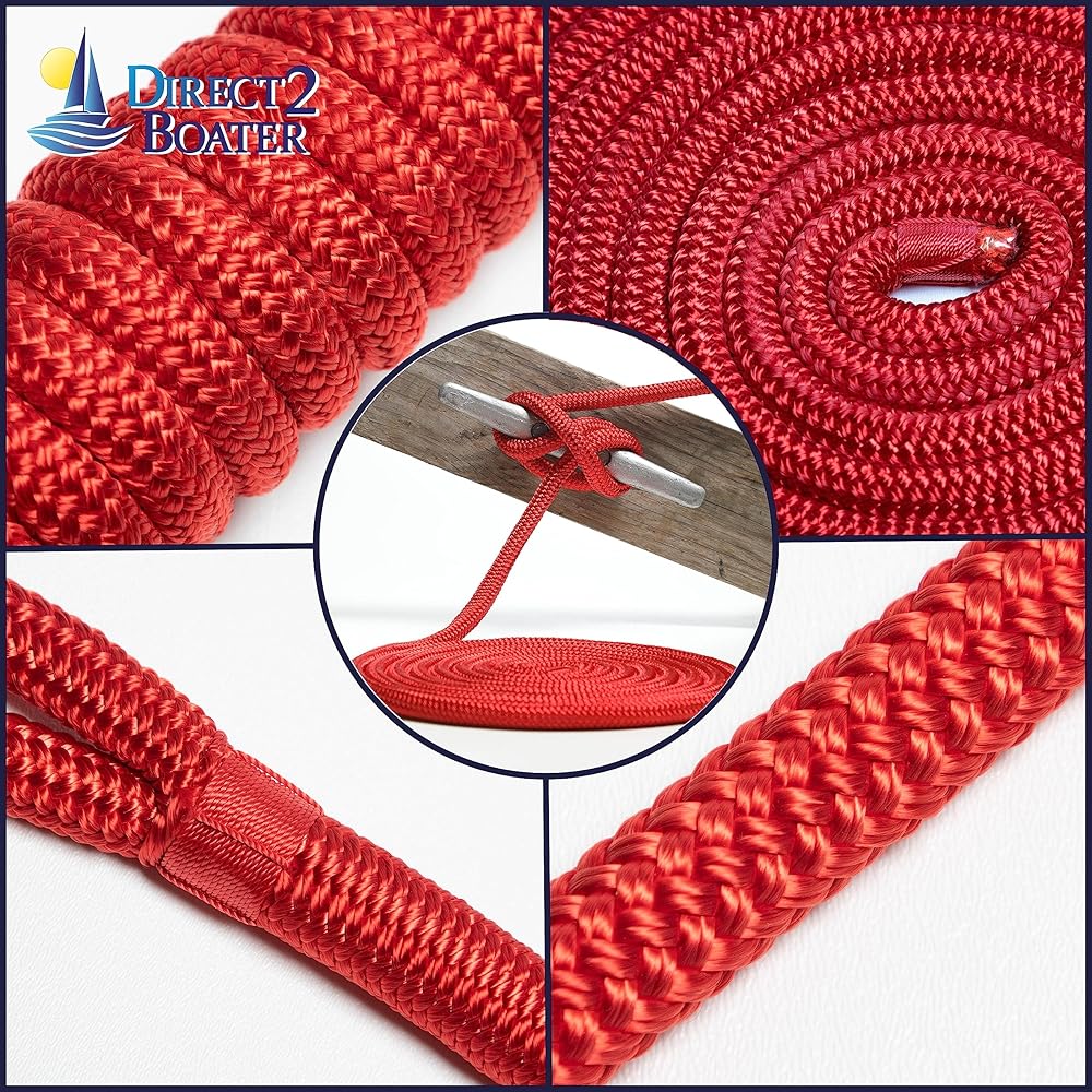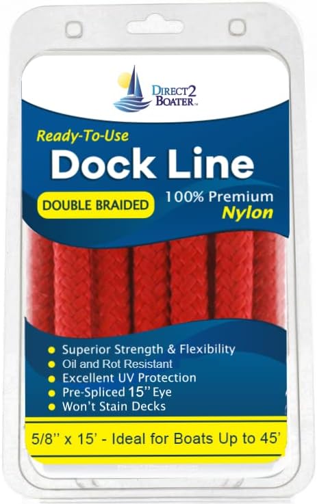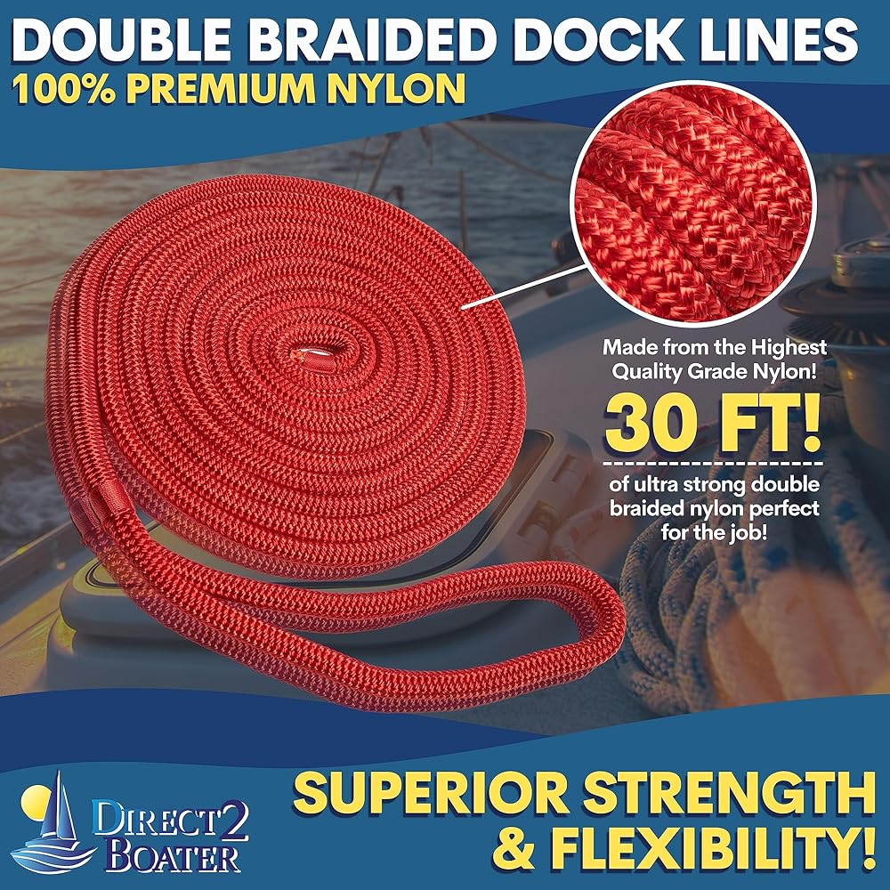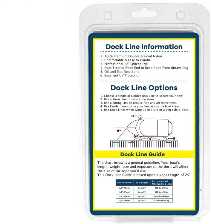 Double Braided 100% Premium Nylon Dock Line - Long Lasting Mooring Rope - Strong Nylon Dock Ropes for Boats - Marine Grade Sailboat Docking Rope This Premium Double Braided 100% Nylon Dock Line is Comfortable and Easy to Handle. It's made from the Highest Quality Marine Grade Nylon. Double Braided Nylon Rope has Superior Strength and Flexibility, is easy to Coil and is basically kink free. It has Excellent Resistance to Sunlight (UV Protection). Please note, storing all Ropes away from Sunlight will Increase Longevity. This rope has a Professional Pre-Spliced Eye.
