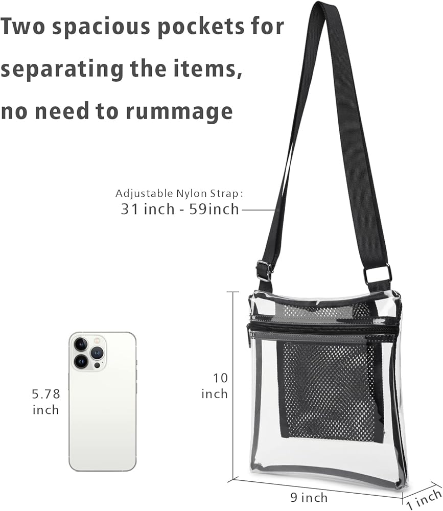 • سيناريوهات متعددة: حقيبة كروس شفافة هي محفظة مثالية للملعب، مع حقيبتنا الشفافة، يمكنك أخذها إلى الملاعب والحفلات الموسيقية والمهرجانات والسفر والمطارات والعمل أو أي مناسبة خارجية