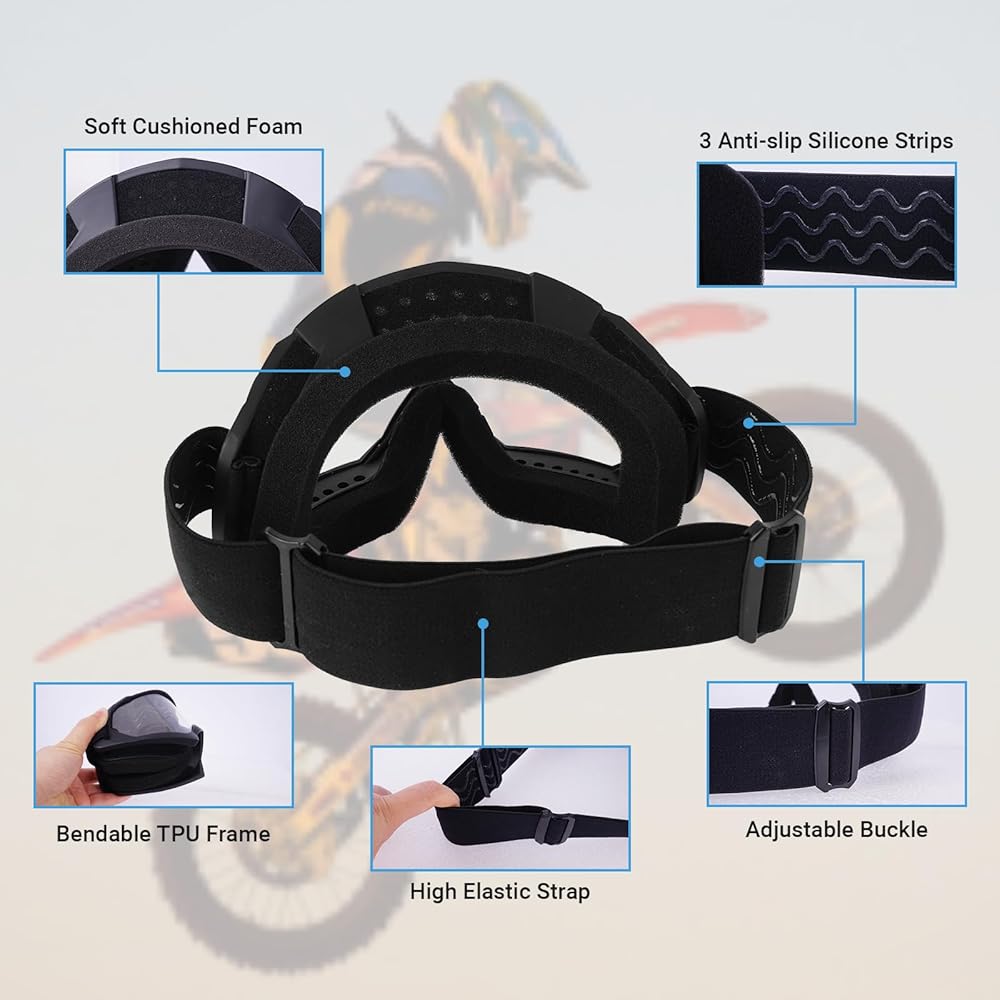 【Adjuatable Elastic Strap】ATV goggles are equipped with 3 adjustable non-slip silicone straps, which can securely hold the goggles in place and adjust the length to fit different helmets and head sizes, which is suitable for adults, youths and children.