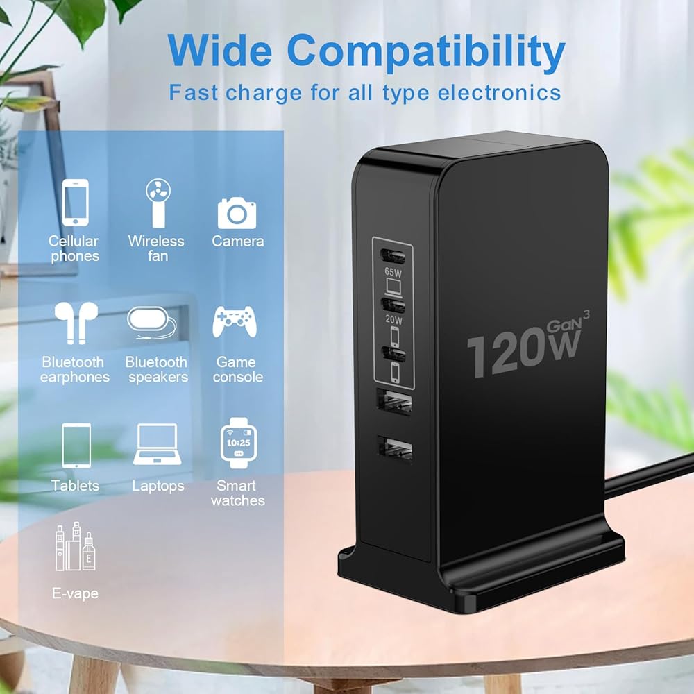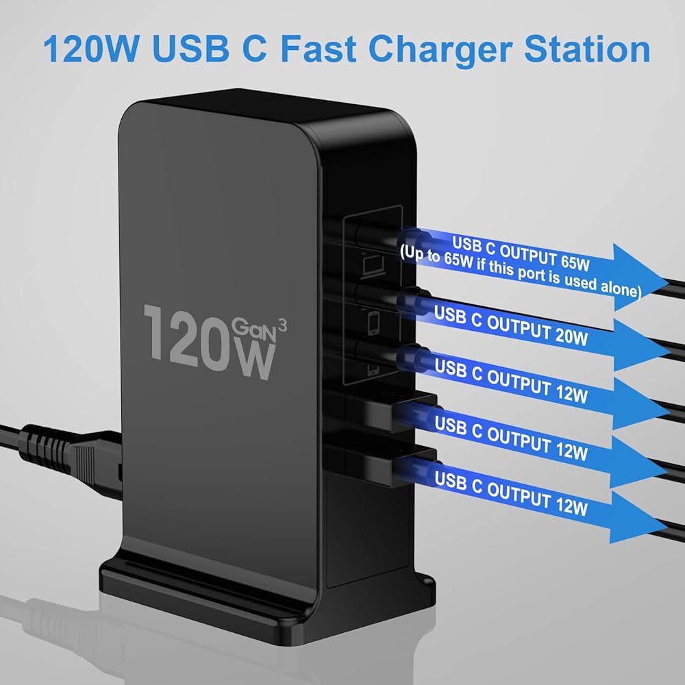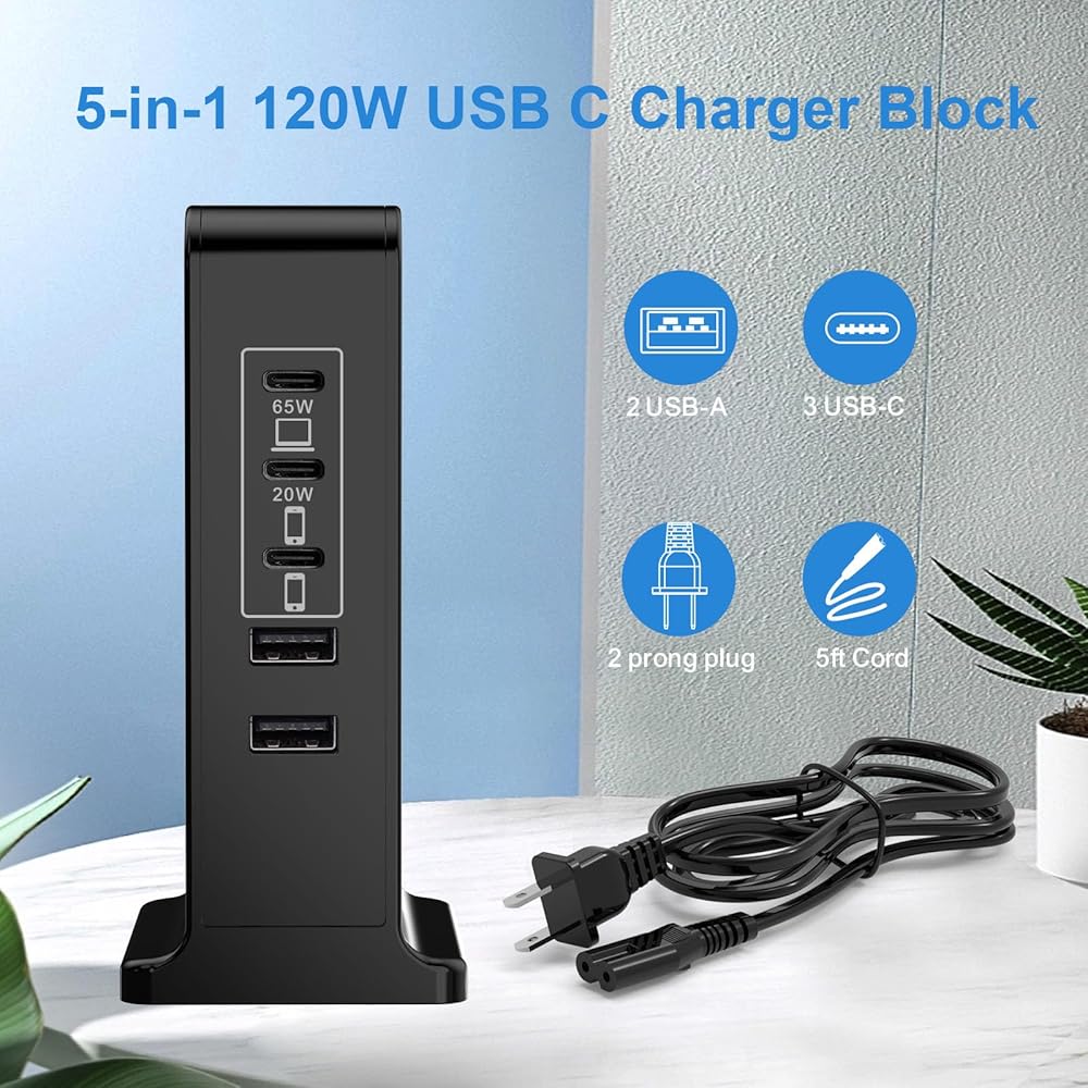 • 𝟓-𝐈𝐍-𝟏 𝐔𝐒𝐁 𝐂 𝐂𝐇𝐀𝐑𝐆𝐄𝐑 𝐁𝐋𝐎𝐂𝐊: يشتمل شاحن USB c بقدرة 120 واط على 5 منافذ شحن سريع لأجهزة متعددة. تشترك محطة الشحن هذه لأجهزة متعددة في إجمالي خرج يصل إلى 120 واط مع 3 منافذ USB-C ومنفذين USB-A، وهو 65 واط + 20 واط + 12 واط + 12 واط + 12 واط. يمكنك شحن جهاز كمبيوتر محمول واحد (مثل Macbook Air 15 بوصة) مع PD 65W، و1 iphone (مثل iPhone 15 Pro Max) مع PD 20W وشحن 3 أجهزة أخرى بقوة 5V/2.4A في وقت واحد، وهو ما يعادل امتلاك 5 قطع من الشاحن.