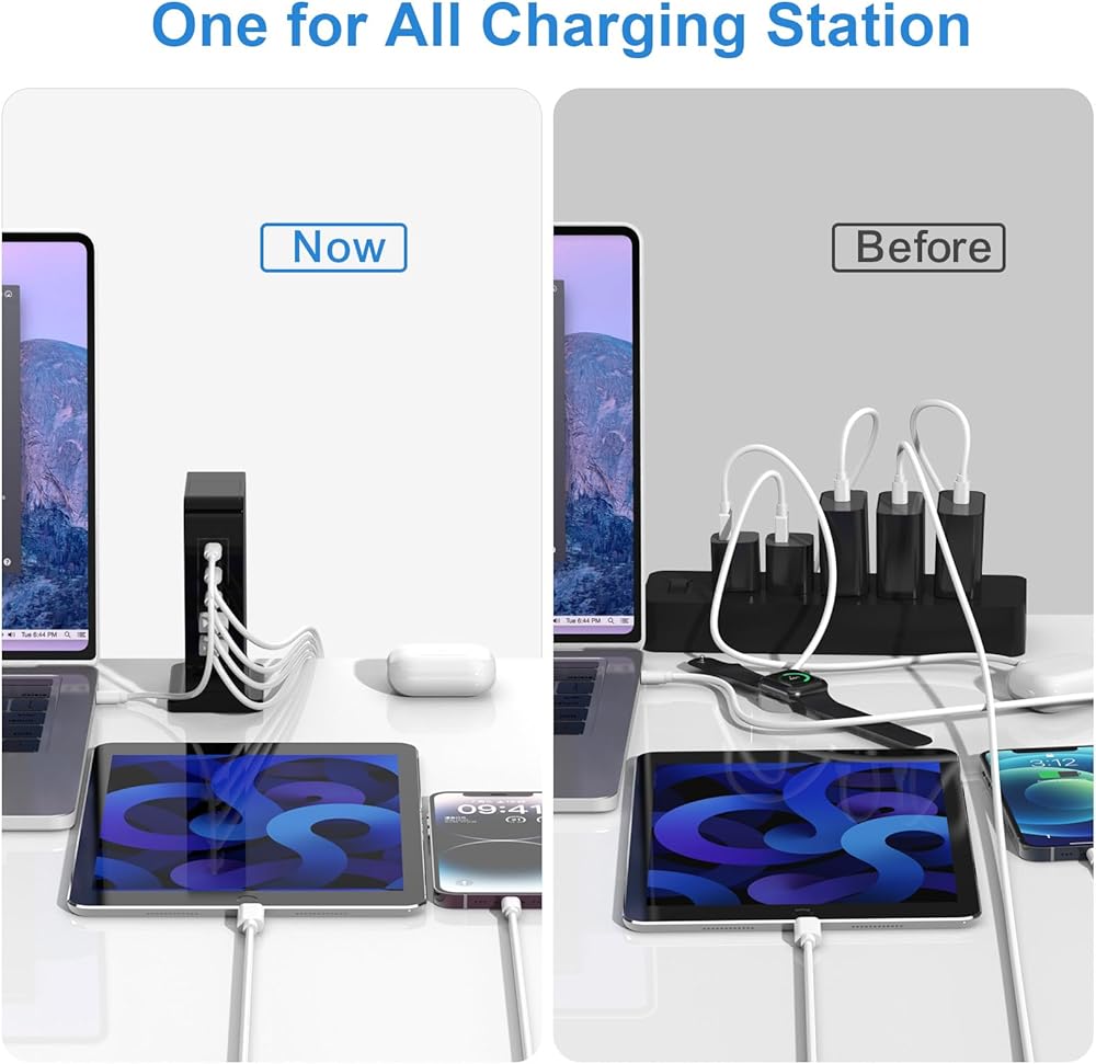 • مَا 𝐎𝐍: تعتبر مجموعة شاحن USB C هذه ذكية من خلال توزيع الكمية الصحيحة تلقائيًا على كل جهاز مع سلك طاقة مصاحب بطول 5 أقدام/1.5 متر. تتحول شريحة IC الذكية المدمجة في محطة الشحن هذه إلى وضع الشحن المتقطع عندما تكون البطارية ممتلئة بسرعة، مما يحمي عمر الخدمة الطويل للبطارية. مثالي لأجهزة Macbook وiPhone وiPad وSamsung وجميع أجهزة USB وusb c.