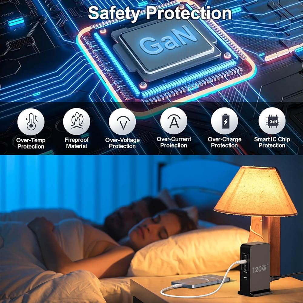 • شاحن يو اس بي سي بقدرة 120 واط مزود بحماية معززة: حماية من درجة الحرارة الزائدة والتيار الزائد والجهد الزائد والشحن الزائد والتحميل الزائد والحرارة الزائدة. وماس كهربائى. كما أن شاحن USB-C الخاص بنا معتمد من UL وETL وCE وFCC، مما يضمن حماية 100% لك ولجهازك. يأتي برج محور الشحن USB C هذا بجسم صغير مناسب للجيب، للذهاب إلى أي مكان تأخذك فيه الرحلة.