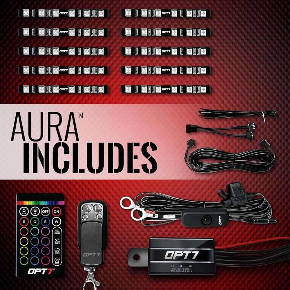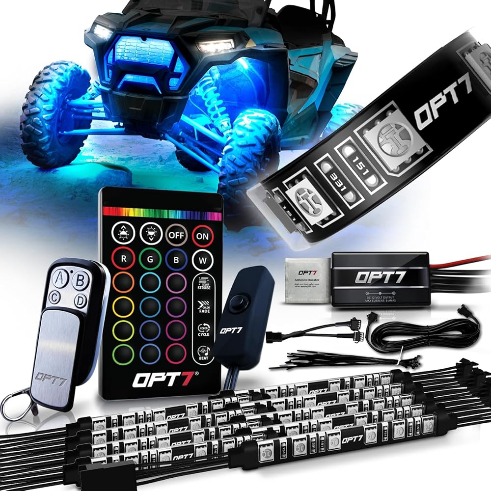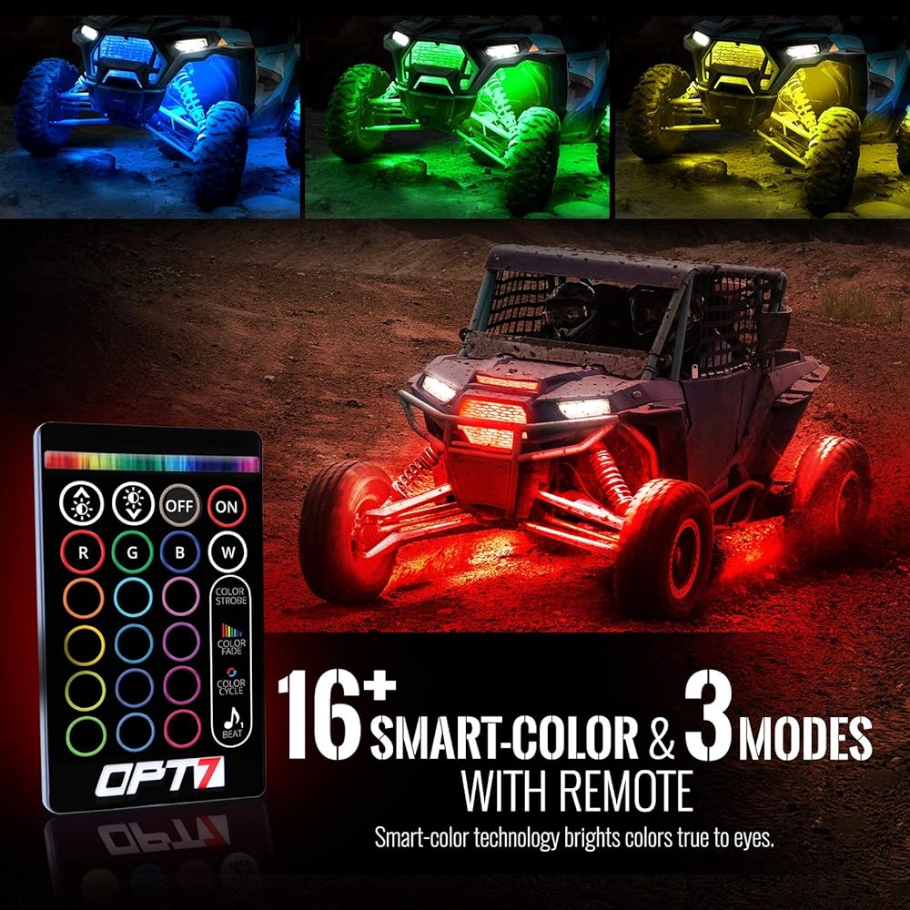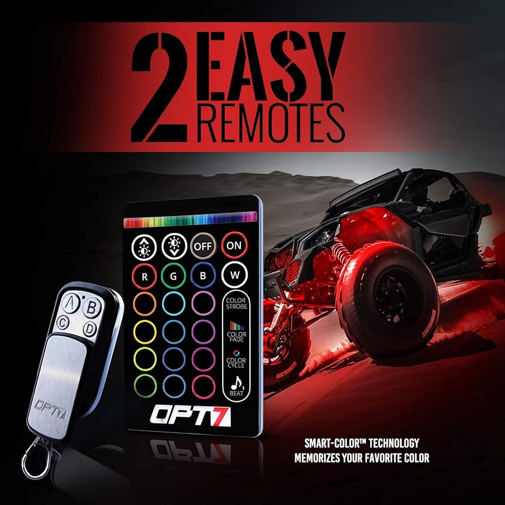 طقم إضاءة LED OPT7 Aura ATV UTV Underglow LED، شرائط لهجة نيون متعددة الألوان RGB مع مستشعر فرامل ذكي، مفتاح تحكم عن بعد لاسلكي، وحدة تحكم بسلسلة مفاتيح 4، مقاومة للماء IP67، 12 فولت، 10 قطع