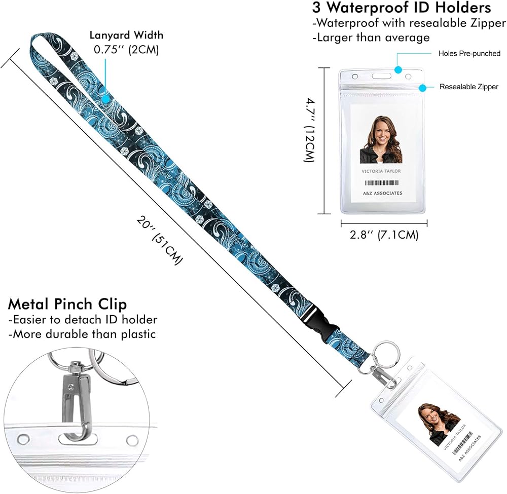 المقاس والمواد: حبل قصير، عرض 0.75 بوصة (2 سم)، طول 20 بوصة (51 سم) من الرقبة إلى أعلى مشبك الشارة. حامل شارة الهوية البلاستيكية المقاومة للماء: 2.8*4.7 بوصة (7.1*12 سم). نسيج حبل قصير، ناعم، قابل للغسل بنسبة 100% من البوليستر مع ملمس حريري. ملحقات معدنية متينة عالية الجودة. فك مشبك بلاستيكي.