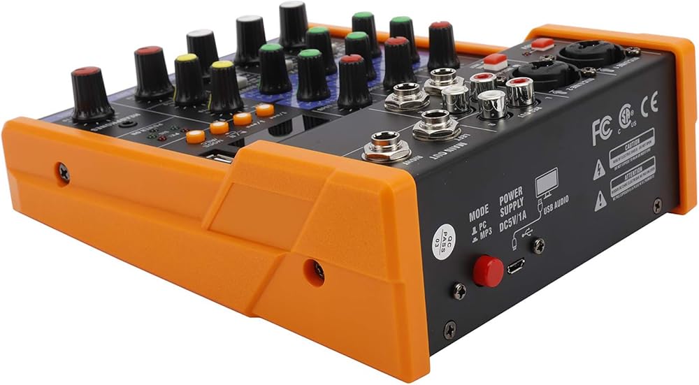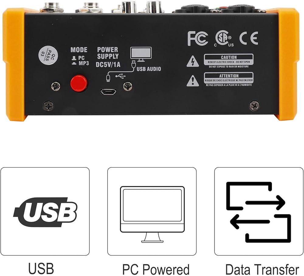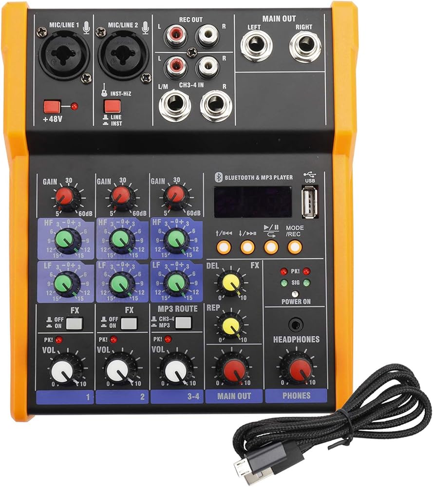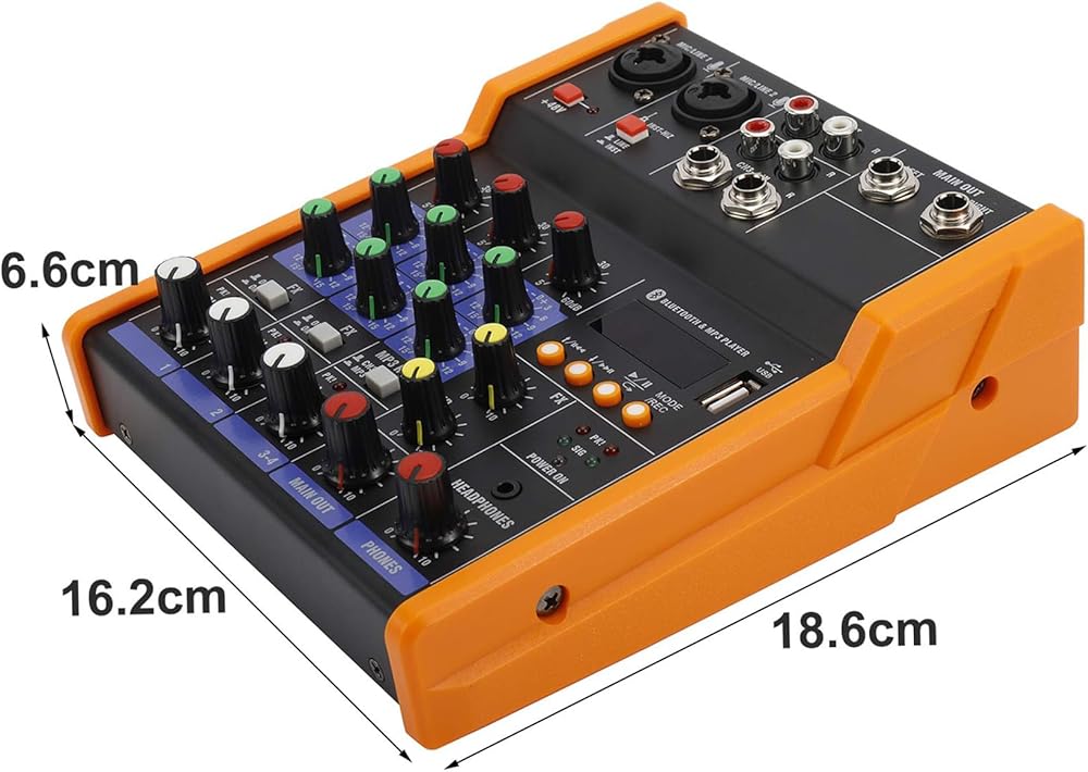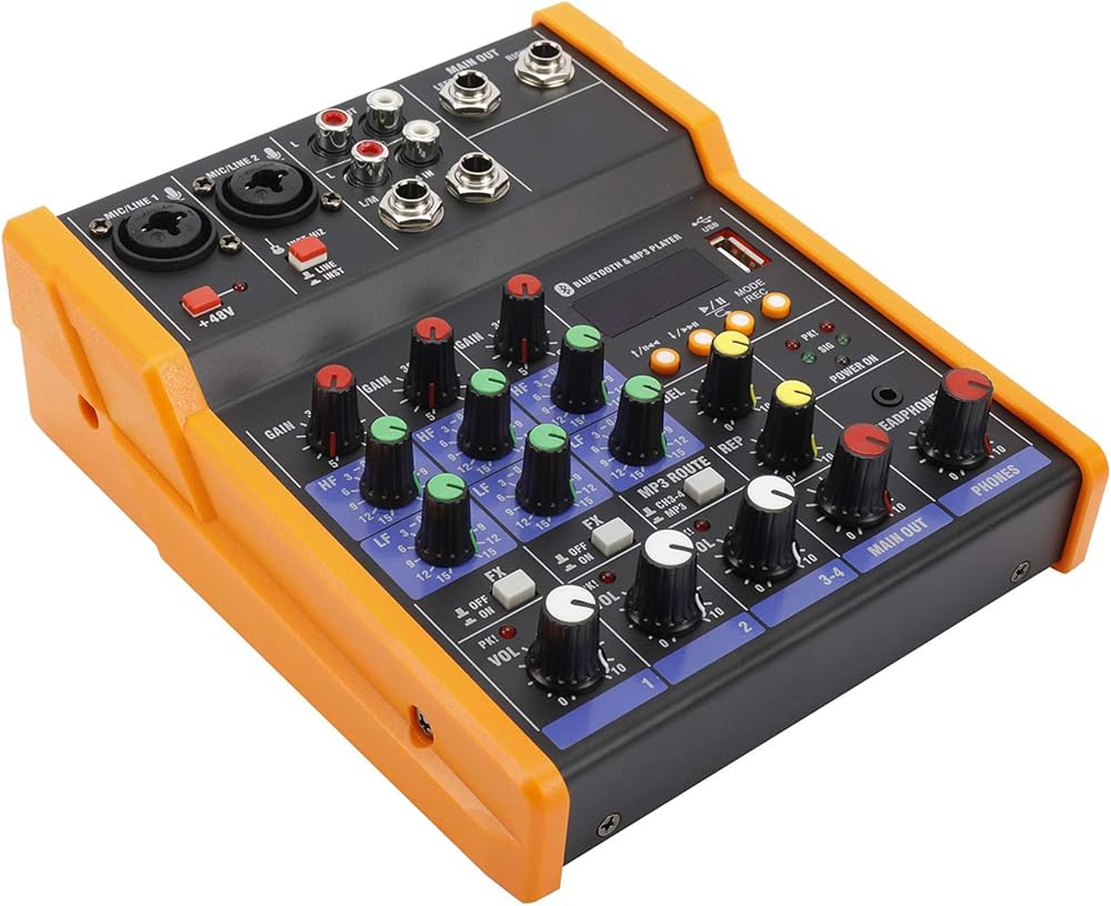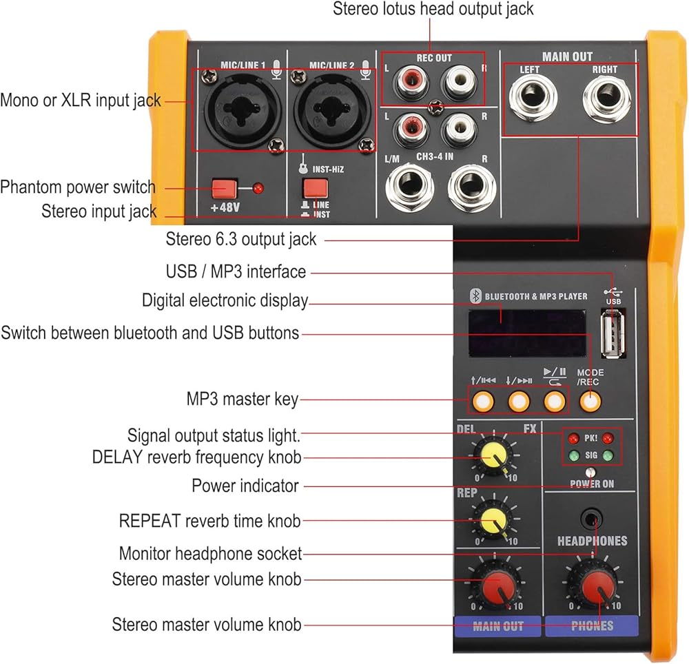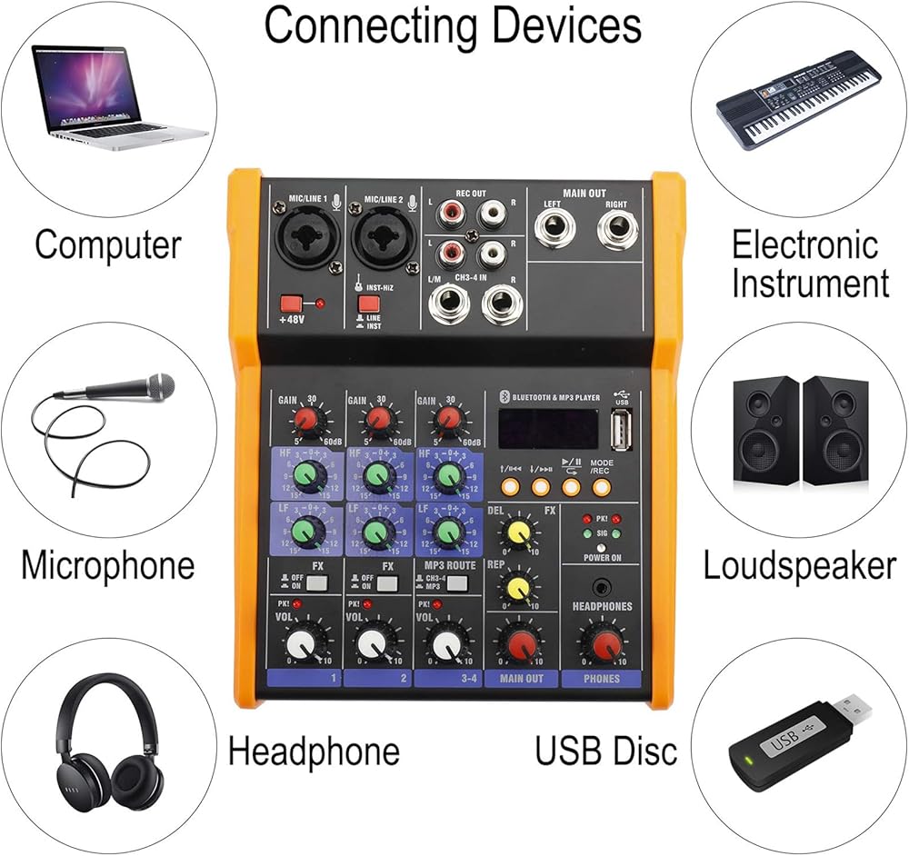 【خلاط بلوتوث】يحتوي خلاط DJ المحمول ذو 4 قنوات على بلوتوث للبث اللاسلكي واستخدامه كمدخل لمزج الإشارة مع قنوات الإدخال الأخرى. يعمل مع الكمبيوتر والهاتف والكمبيوتر اللوحي ومشغل MP3.