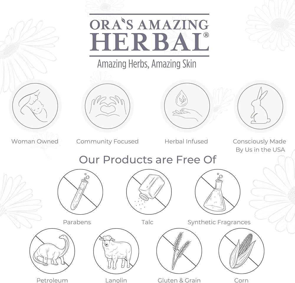 تم اختباره سريريًا. خالي من الكورتيزون والمواد الكيميائية والعطور والبارابين والفازلين والمواد الاصطناعية والغلوتين ولم يتم الإساءة إلى الحيوانات لتصنيعه. Ora's Amazing Herbal هي شركة مملوكة للنساء، ونحن نصنع منتجاتنا في منشأتنا المسجلة في الولايات المتحدة الأمريكية.