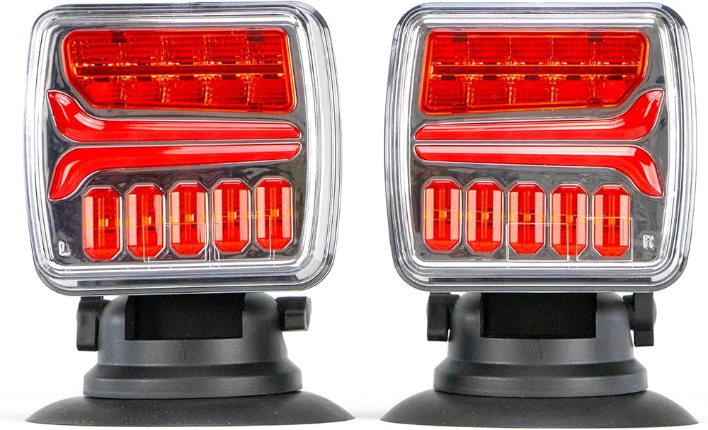 مصابيح إيقاف ودوران وإضاءة خلفية فائقة السطوع بالإضافة إلى نطاق 100 قدم وعمر بطارية طويل - يمكن رؤية مصابيح LED الساطعة للتوقف والانعطاف والتشغيل على بعد ميل واحد وتعمل على إطفاء المصابيح الأمامية لسيارتك وأضواء الفرامل وإشارات الانعطاف. يتمتع جهاز الإرسال والأضواء بمدى يصل إلى 100 قدم للوصول إلى الجزء الخلفي من أي مقطورة أو مركبة مسحوبة. تعمل المصابيح اللاسلكية لمدة تصل إلى 8 ساعات عند الشحن الكامل، ويمكن إعادة شحنها بسهولة خلال ساعتين تقريبًا. تشتمل كل وحدة أيضًا على ضوء لوحة ترخيص أبيض.