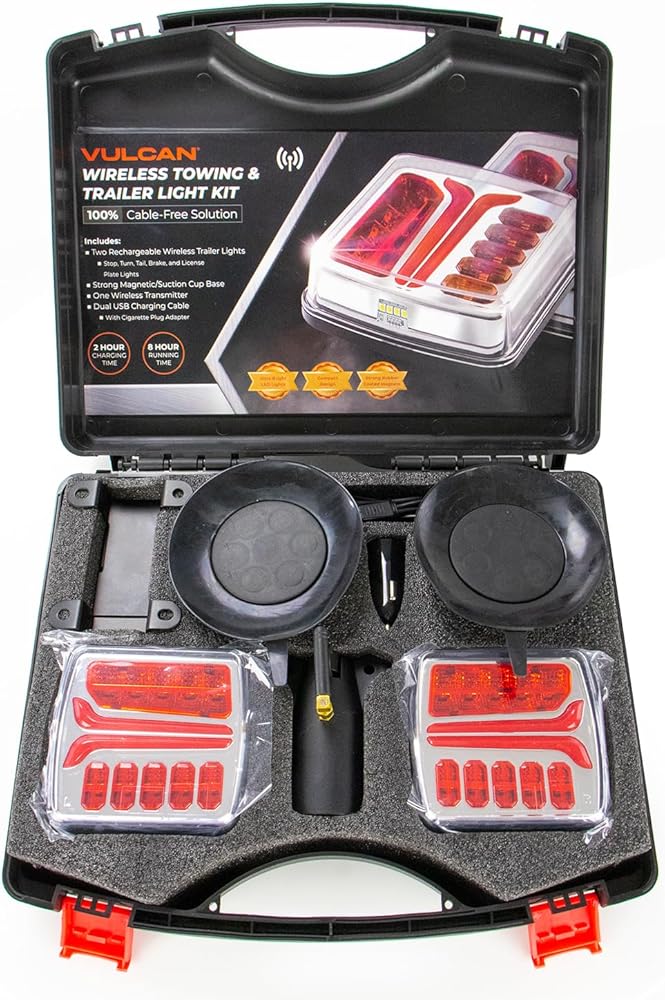 مجموعة كاملة للقطر والسحب اللاسلكية - سهلة الاستخدام والتركيب في ثوانٍ. تشتمل على مصباحين للمقطورة لاسلكيين قابلين لإعادة الشحن، ودعامتين للتثبيت رأسيًا وأفقيًا، ومغناطيسات شديدة التحمل مع أكواب شفط، وجهاز إرسال شفرة بـ 7 أسلاك، وكابل شحن USB مزدوج لشحن كلا المصباحين في نفس الوقت، ومحول قابس سجائر USB ومحول قوي، حقيبة حمل مريحة. قم بالسحب بثقة، مجموعة مصابيح السحب هذه مدعومة بالخبرة الصناعية التي لا يمكن أن توفرها سوى فولكان.