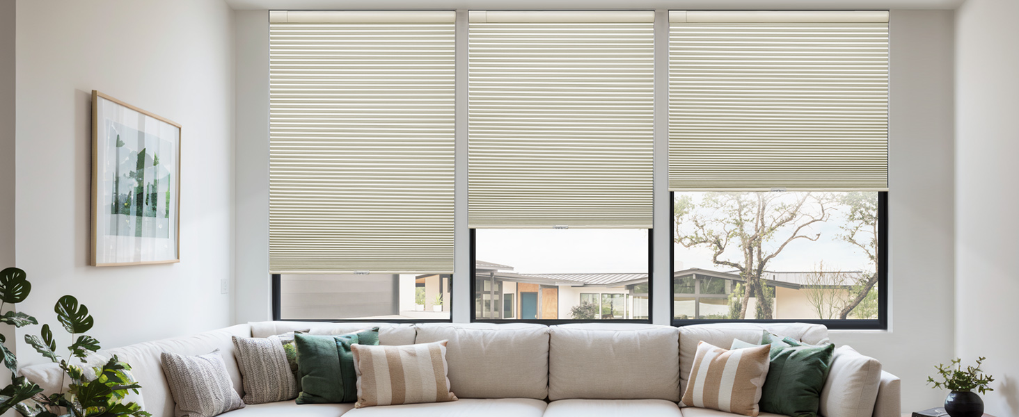 【تصميم بدون حبال】تعمل الظلال الخلوية بدون أسلاك على إلغاء الحاجة إلى أسلاك أو عصا لرفع وخفض الظل الخلوي، واستبدالها بتشغيل يدوي بسيط، مما يجعل الظل أسهل في الاستخدام ويقلل من خطر التعثر أو التشابك، ومناسب للمنازل مع الأطفال أو الحيوانات الأليفة.