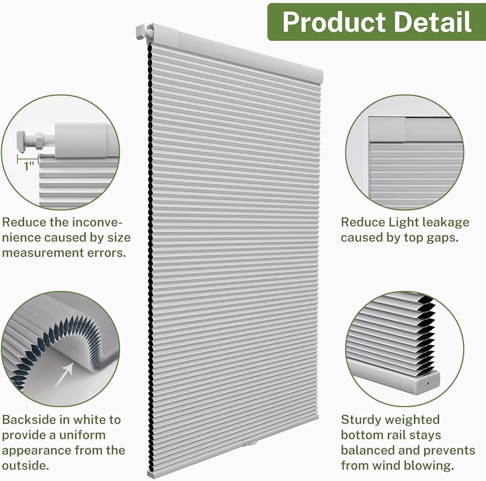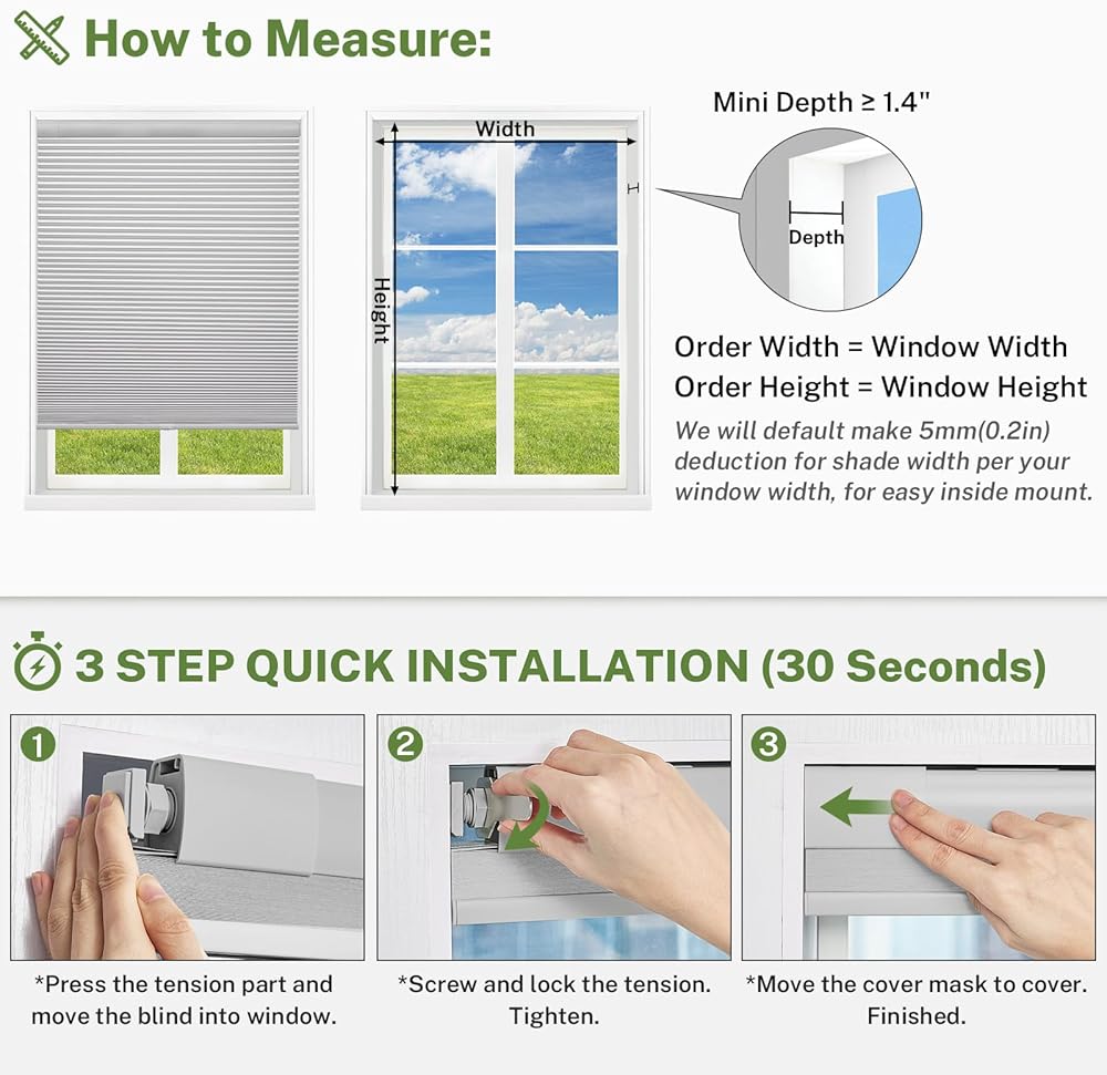 【خصم بوصة】 سيتم تقليل عرض الستائر والظلال الخلوية من MiLin بمقدار 0.2 بوصة لسهولة التركيب الداخلي. ارتفاع الظلال 64 بوصة مناسب أيضًا لارتفاعات النوافذ التي تتراوح بين 52 بوصة و64 بوصة.
