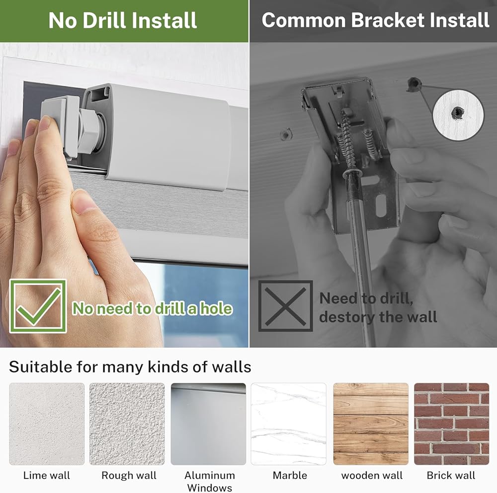 【لا حاجة للحفر ولا حاجة لأي أدوات】لم تعد هناك حاجة للقلق بشأن تلف الجدار الناتج عن الحفر. لا تتطلب الستائر الخلوية اللاسلكية التي لا تحتاج إلى حفر أي أدوات أو حفر. يمكن تركيبها بسهولة وأمان على الحائط عن طريق ضبط طول آلية الدوران. العملية برمتها تستغرق 30 ثانية فقط!