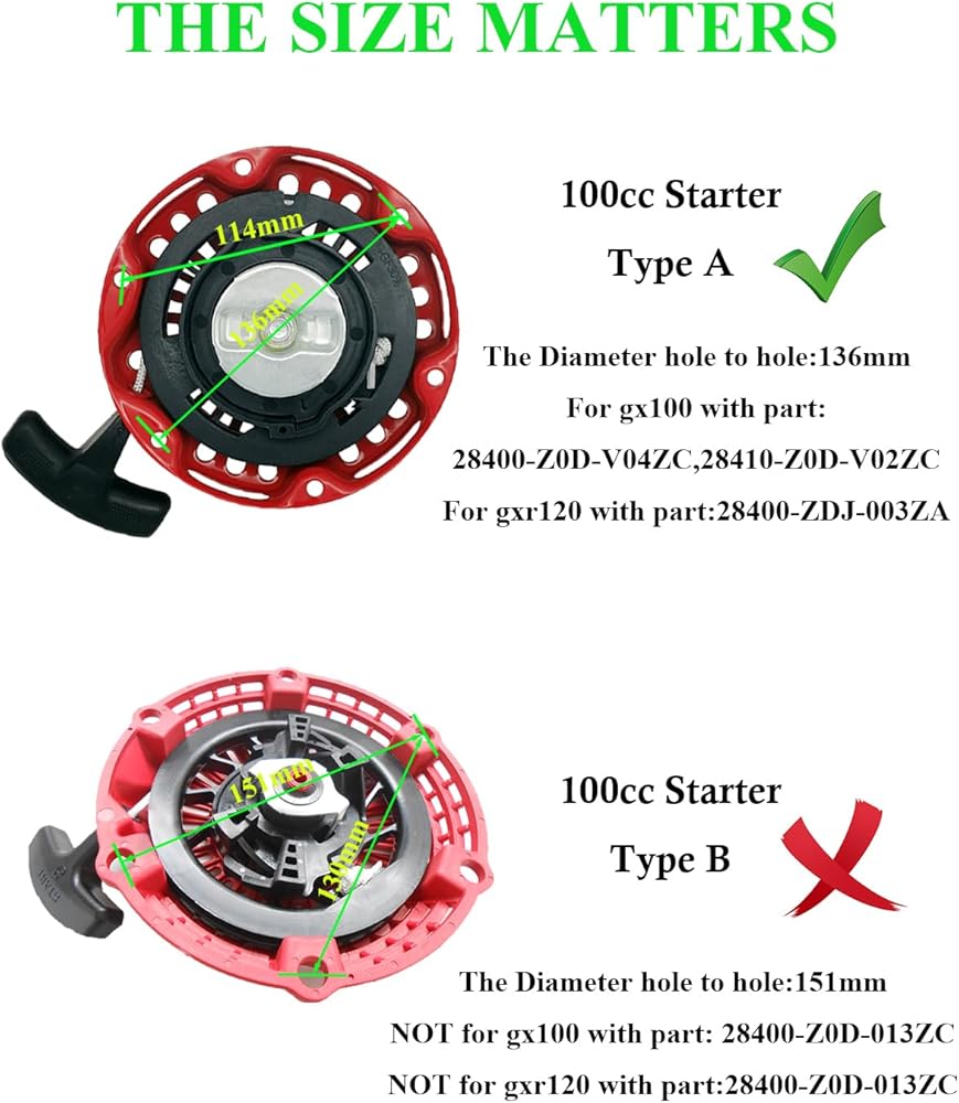 يناسب العديد من موديلات honda GX 100 28400-Z0D-V04ZC GXR 120 28400-ZDJ-003ZA 79.5 80 98 100 cc 2.8 3hp محركات صغيرة مصنوعة في الصين. ملاحظة: اعتمادًا على الطراز المحدد أو الأرقام التسلسلية، تستخدم بعض محركات GX100 وGXR120 مشغل سحب أكبر، بينما يستخدم البعض الآخر مشغل سحب أصغر. يجب عليك التحقق من الأبعاد أو رموز الأجزاء لتحديد ما إذا كان هذا هو جهاز السحب الذي تحتاجه.