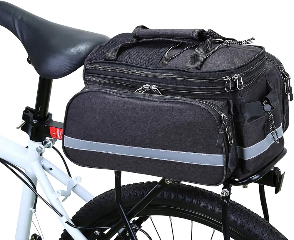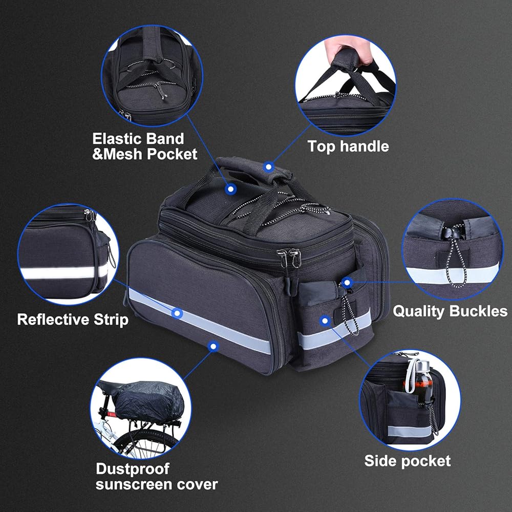 Reflective strip and rear lighting----- There are several reflective strips on the bag to improve the visibility of others when driving at night. A rear light can be attached to the back of this bike bag.