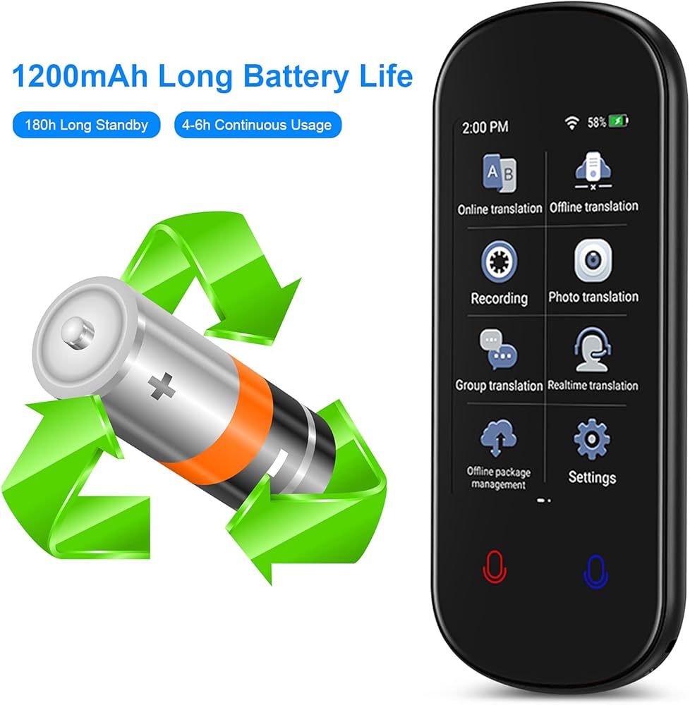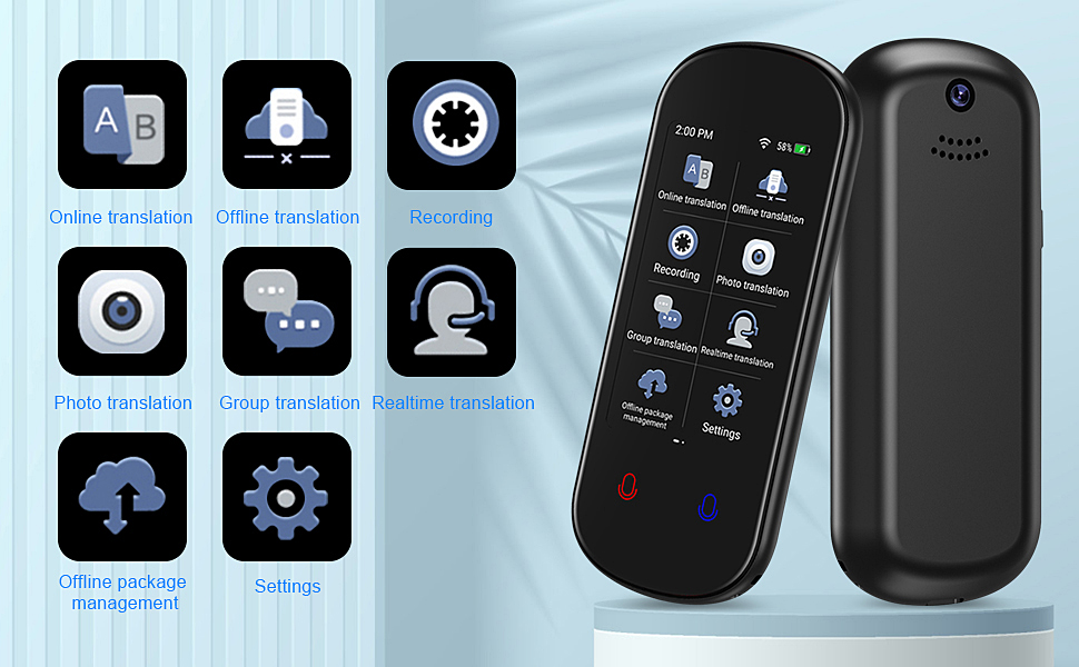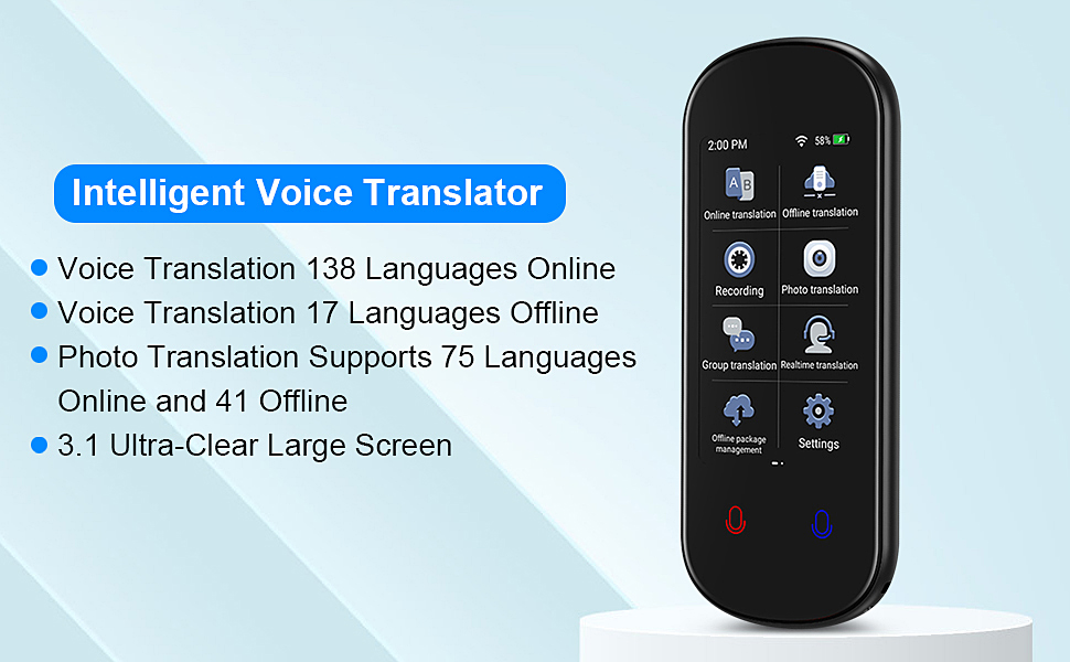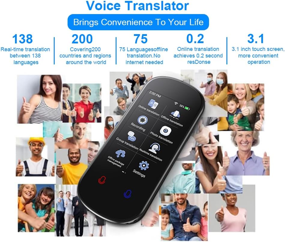 هذا المترجم المحمول يجعل الاتصال بين اللغات أسهل وأكثر ملاءمة. توفر شاشة اللمس عالية الدقة الملونة TFT (IPS) مقاس 3.1 بوصة إمكانية القراءة الكاملة من الكلام إلى النص.