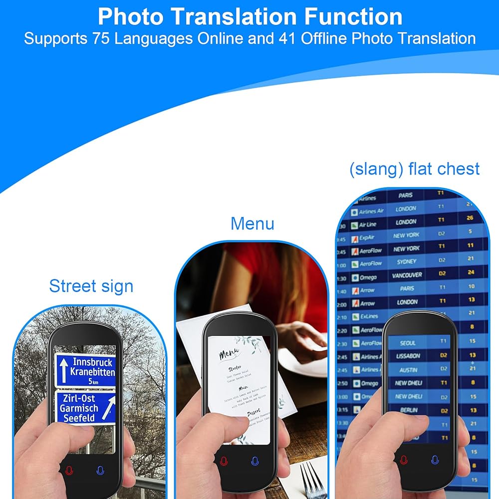 ترجمة الصور: يحتوي جهاز الترجمة الصوتية على كاميرا بدقة 8 ميجابكسل، ويدعم 75 لغة عبر الإنترنت و41 ترجمة للصور دون الاتصال بالإنترنت. يمكن أن تساعدك ترجمة الصور هذه على قراءة القوائم/علامات الطريق/المجلات/الملصقات بلغات مختلفة. قل وداعًا لعوائق التواصل.