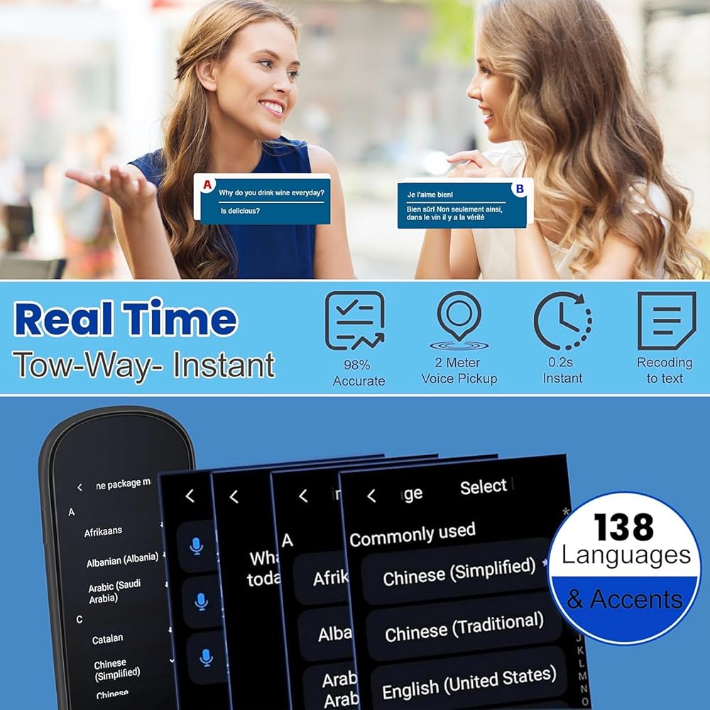 مترجم ذكي 138 لغة: مترجم فوري مع دعم 138 لغة ولهجة، مما يوفر ترجمات دقيقة وأصلية بدقة 98% وترجمات فورية ثنائية الاتجاه في حوالي 0.2 ثانية فقط. تحسين مهارات الاتصال الخاصة بك لكسر الصمت بشكل أسرع.