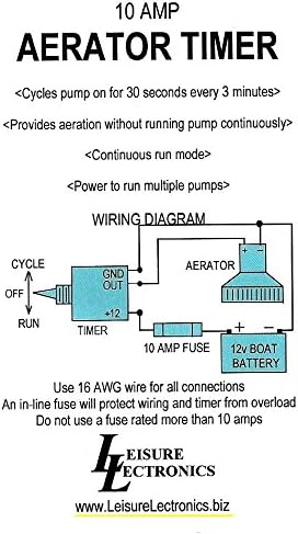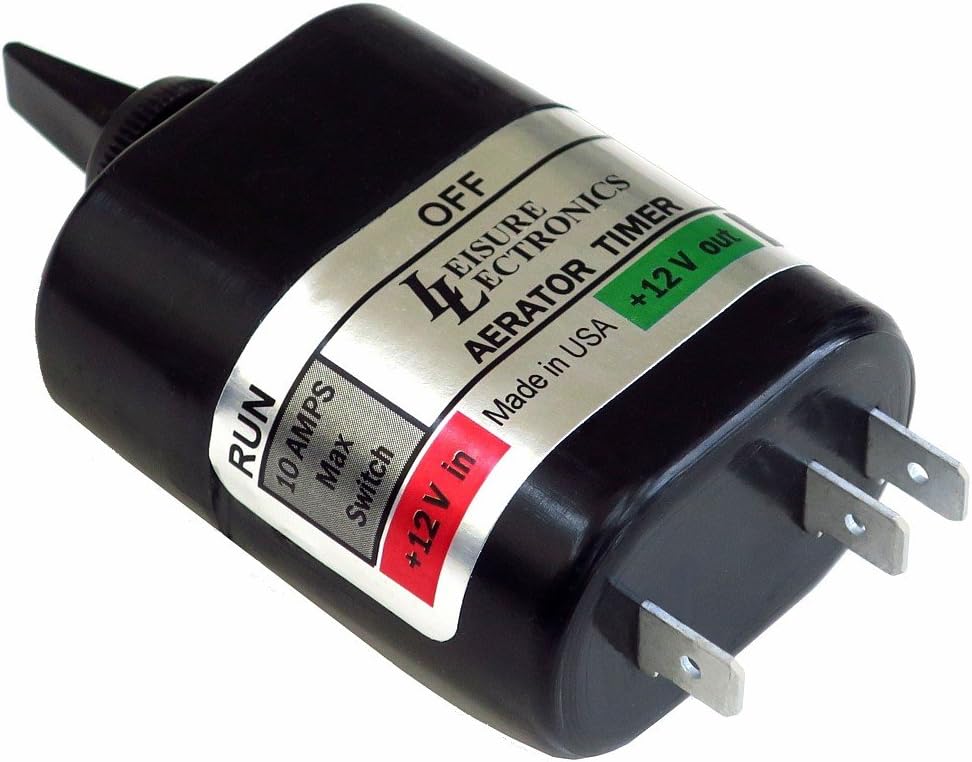 Designed for marine use, a pump timer with a 3-position switch that can run your pump for 30 seconds, once every 3 minutes; or continuously, or switch it Off. MADE IN U.S.A. by Leisure Lectronics, the leading manufacturer of aerator pump timers.