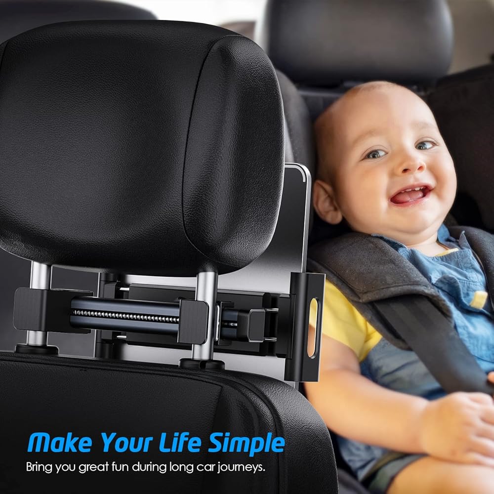 سهل التركيب: يمكن تركيب حامل الجهاز اللوحي للسيارة بسرعة دون الحاجة إلى استخدام أي أداة. ما عليك سوى إرفاقه بمسند رأس سيارتك واجعل الركاب أو أطفالك يستمتعون برحلتهم.