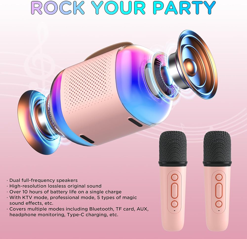 آلة كاريوكي صغيرة للأطفال البالغين، آلة كاريوكي محمولة مع 2 ميكروفونات لاسلكية وأضواء LED ملونة للحفلات المنزلية، لعبة هدية وردية للفتيات 4، 5، 6، 7، 8 سنوات فما فوق من الأطفال الصغار والمراهقين