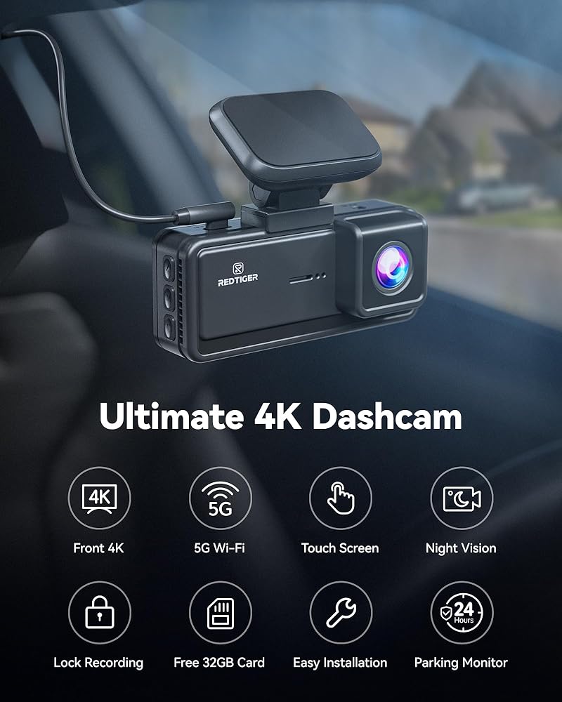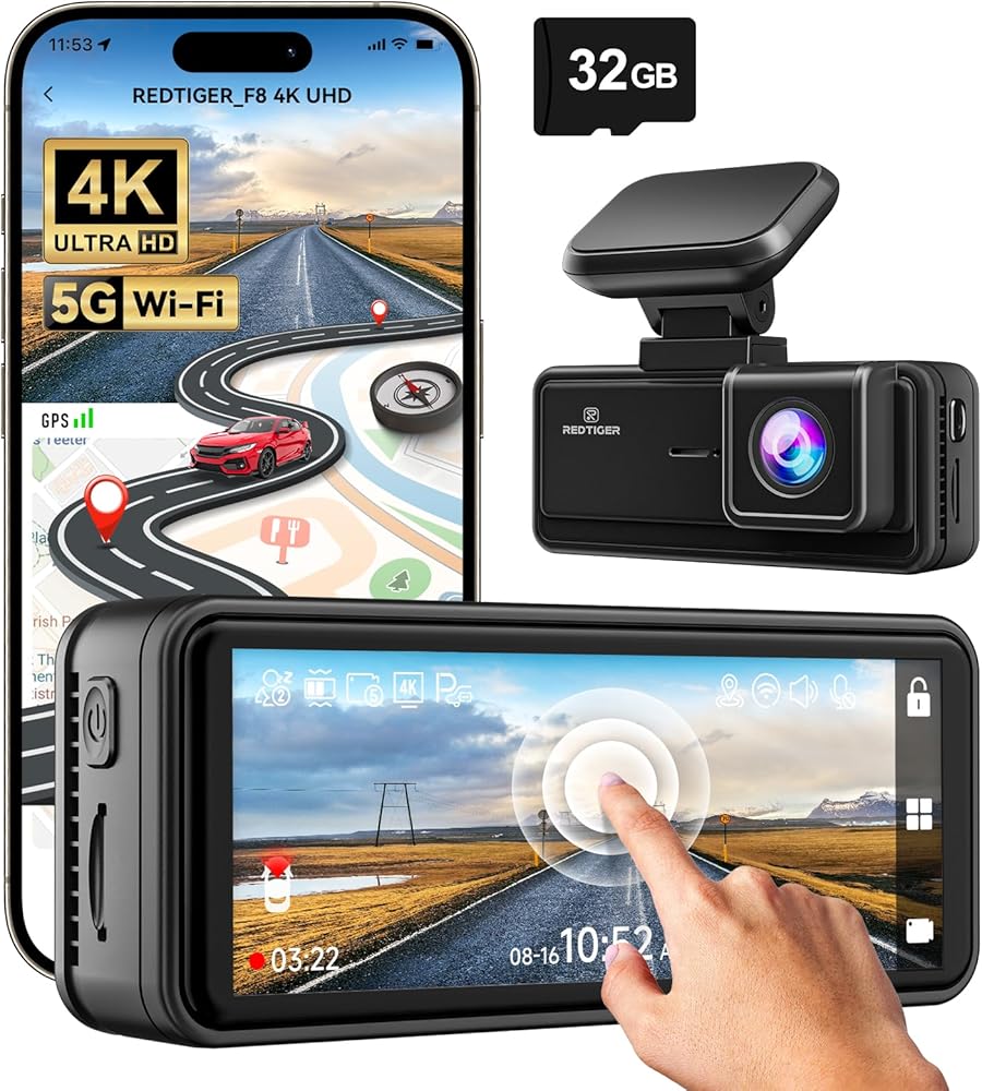 كاميرا أمامية REDTIGER 4K Dash Cam، تحكم في تطبيق Wi-Fi 5G، كاميرا داش بشاشة تعمل باللمس 3.18 بوصة للسيارات، رؤية ليلية 2160P UHD، بطاقة مجانية 32 جيجابايت، زاوية واسعة 160 درجة، نظام تحديد المواقع المدمج، وضع انتظار السيارات، تسجيل حلقي (F8)