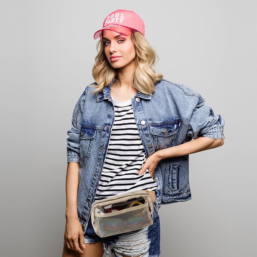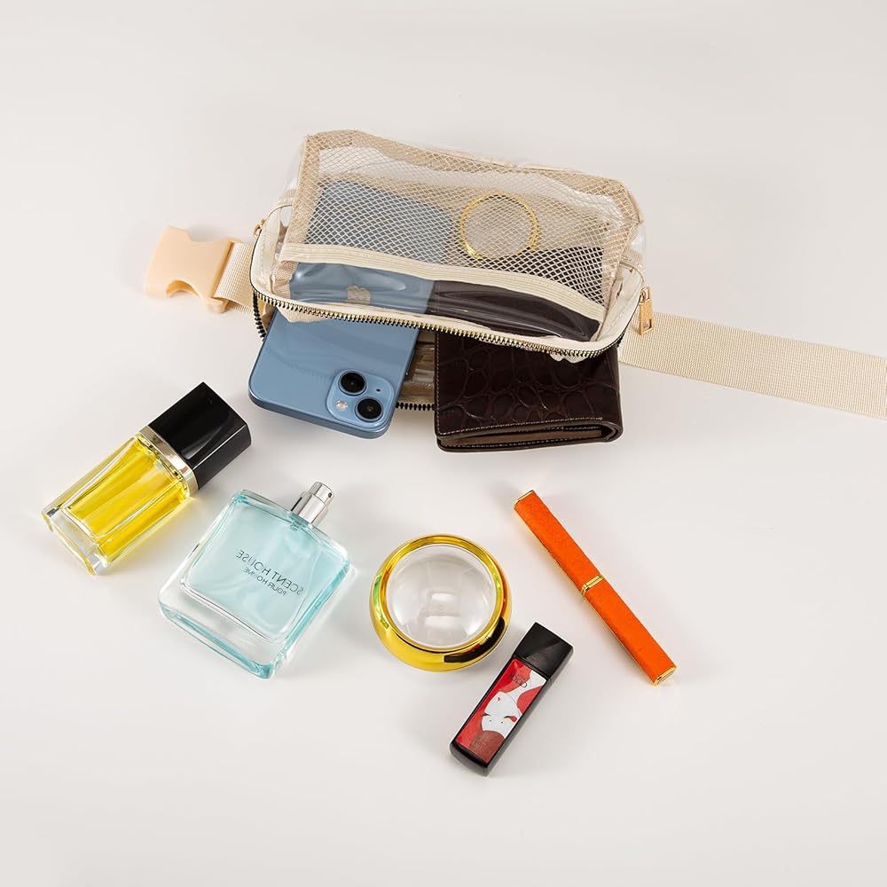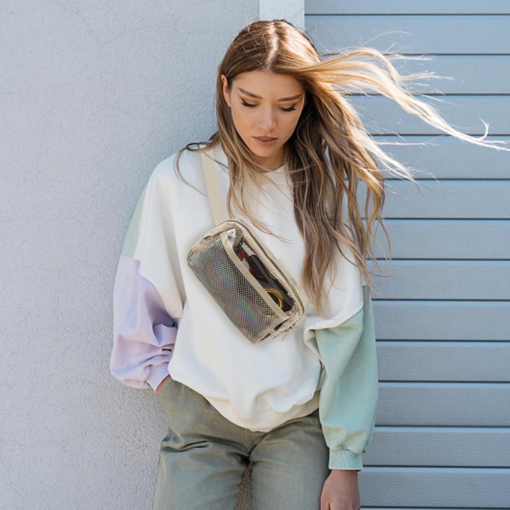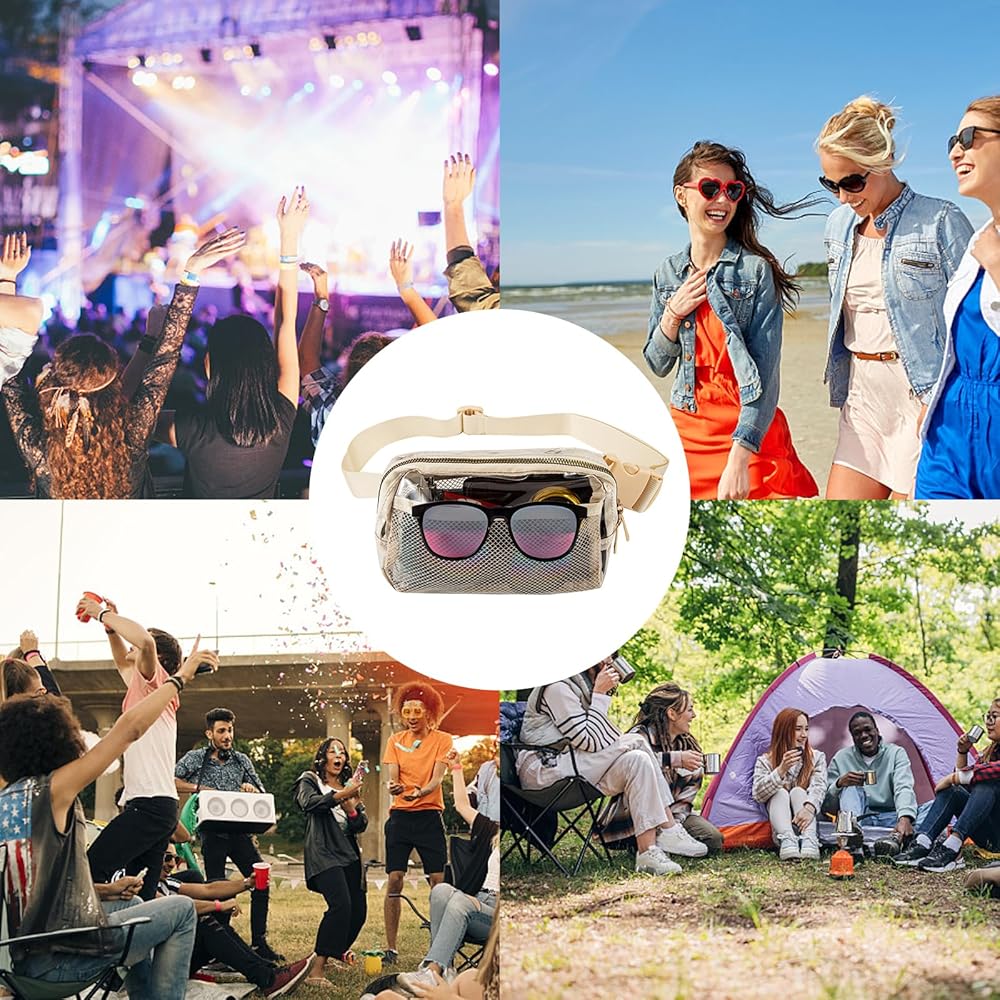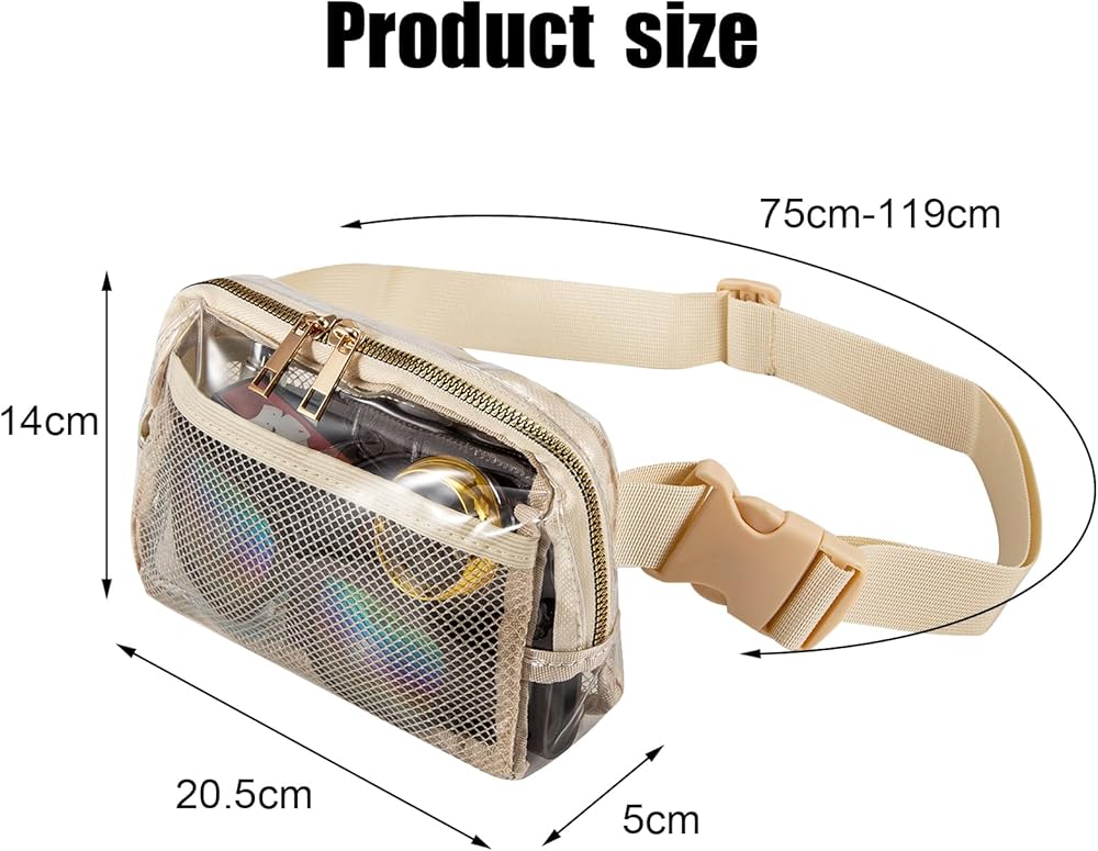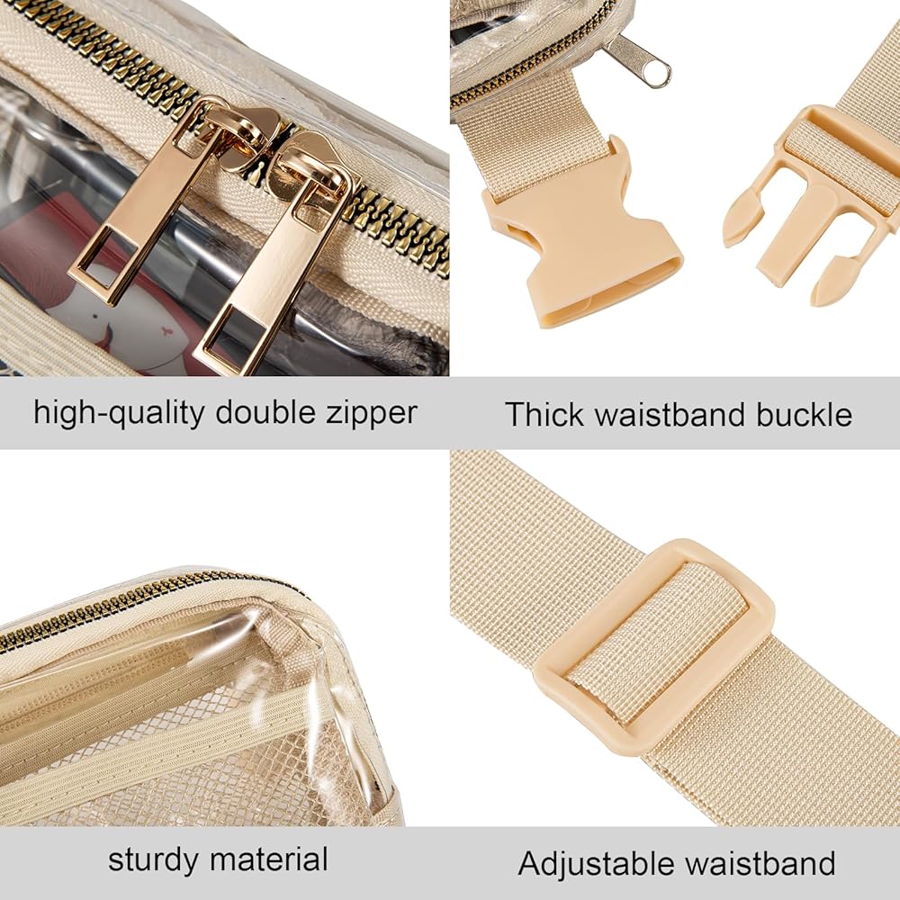 TUYUU Clear Fanny Pack Stadium Approved for Women Men Crossbody Clear Belt Waist Bag Pouch for Concerts Hiking Running Beige