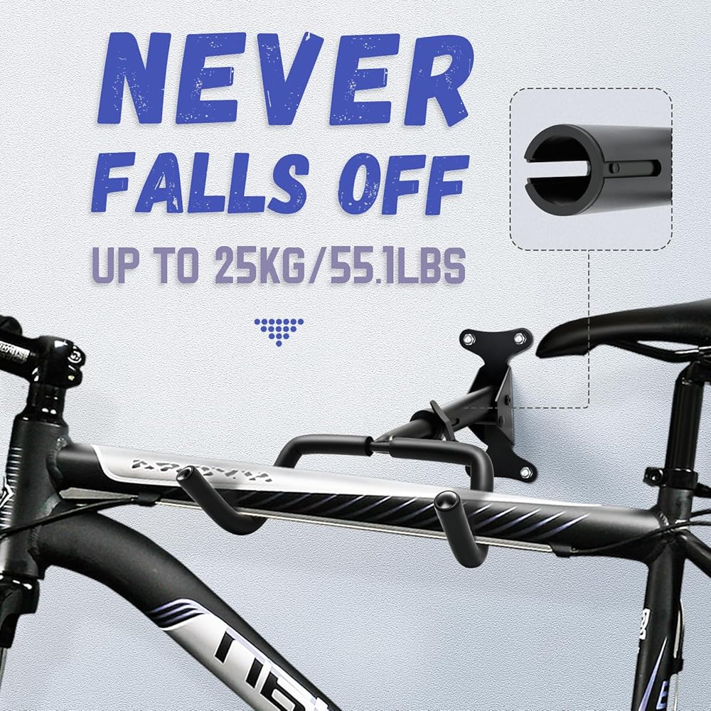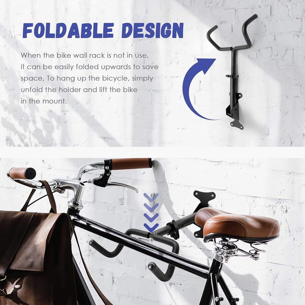 تصميم موفر للمساحة: وفر مساحة أرضية قيمة من خلال حامل الحائط الخاص بالدراجة. يتيح لك تصميمها المدمج والفعال تخزين دراجتك بشكل آمن على الحائط، مما يحافظ على مساحة معيشتك منظمة وخالية من الفوضى.