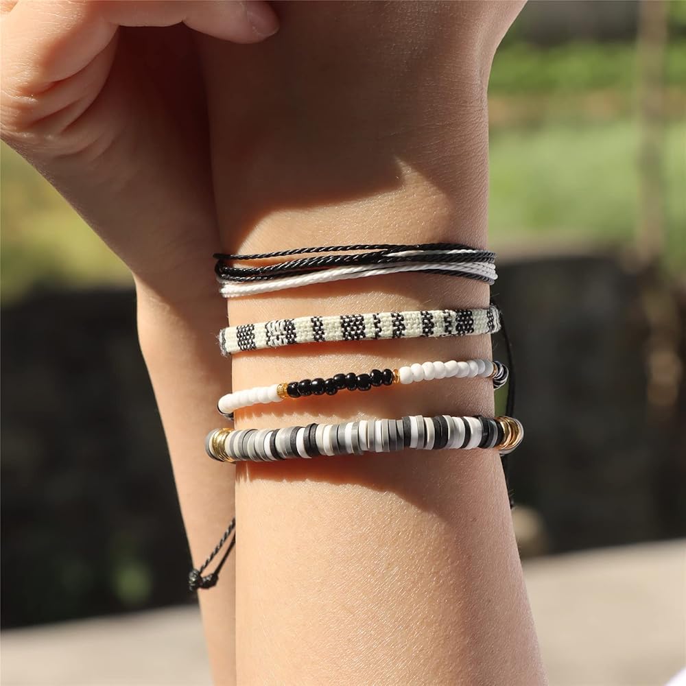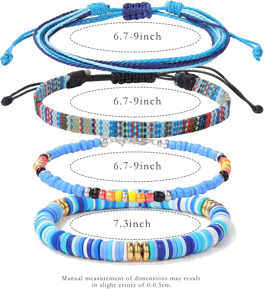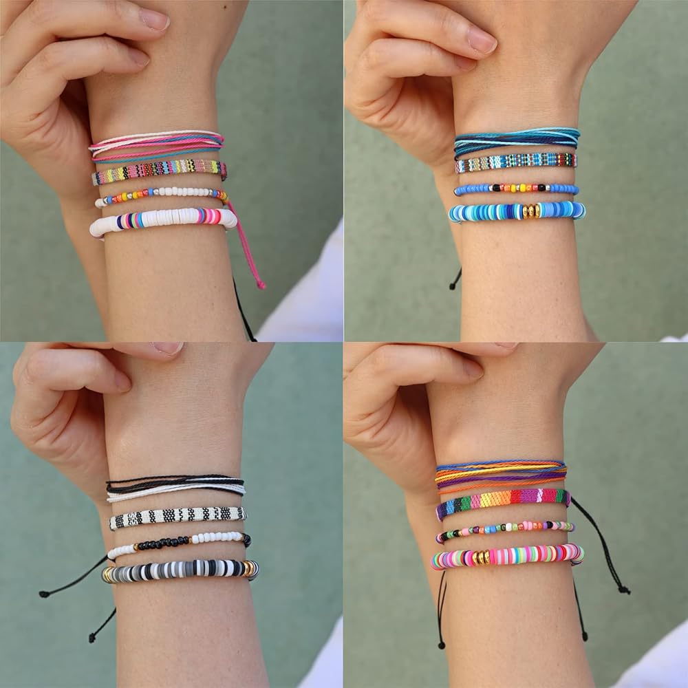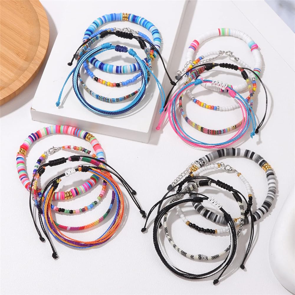 4 Set Bohemia Bracelets: package includes 16pcs adjustable colorful boho bracelets, total 4 different styles: Colorful String Bracelets, Handmade Beaded Bracelets, Woven Braided Rope Bracelets, Heishi Surfer Bracelets.