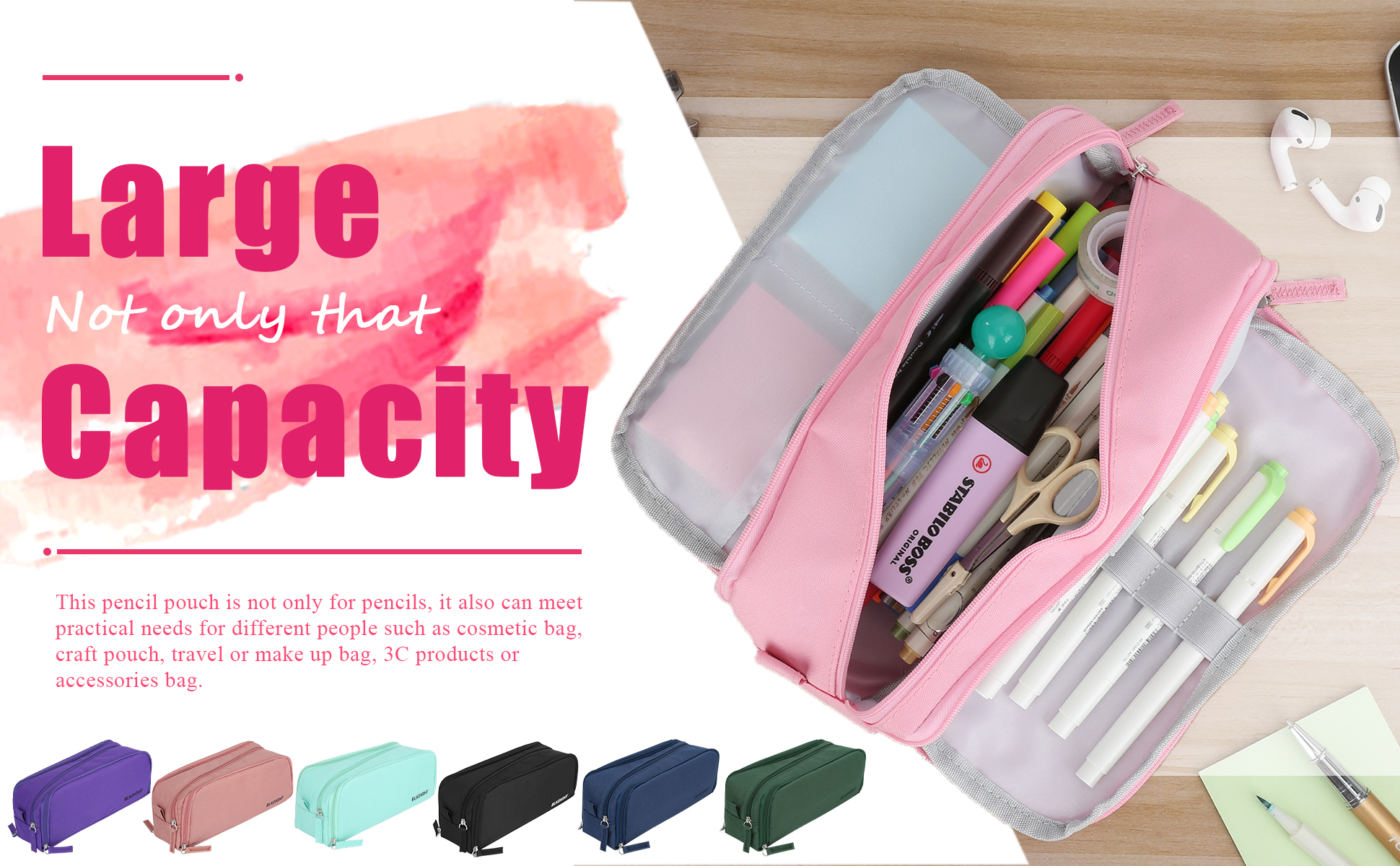 • حقائب متعددة الوظائف: يمكن لحقائب الأقلام الخاصة بنا أن تستوعب اللوازم المكتبية، وحقائب مستحضرات التجميل، وحقائب أدوات الزينة، وحقيبة الأقلام المدرسية، وحقيبة الفن، وحقيبة السفر، إلخ.