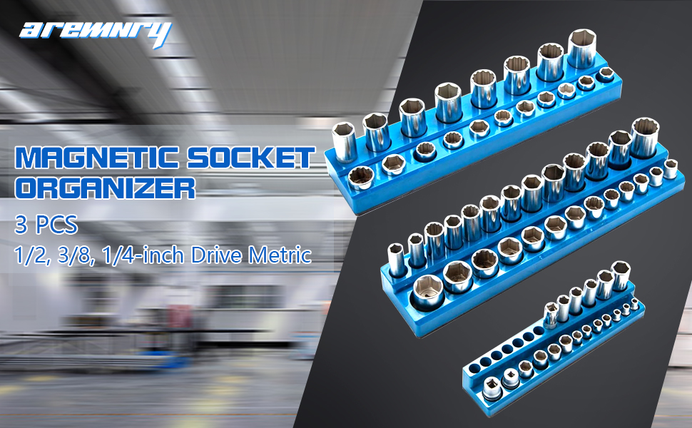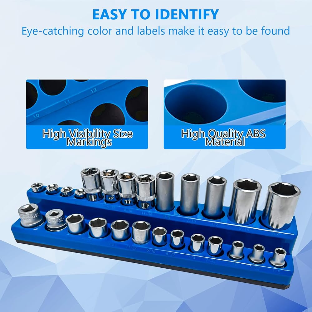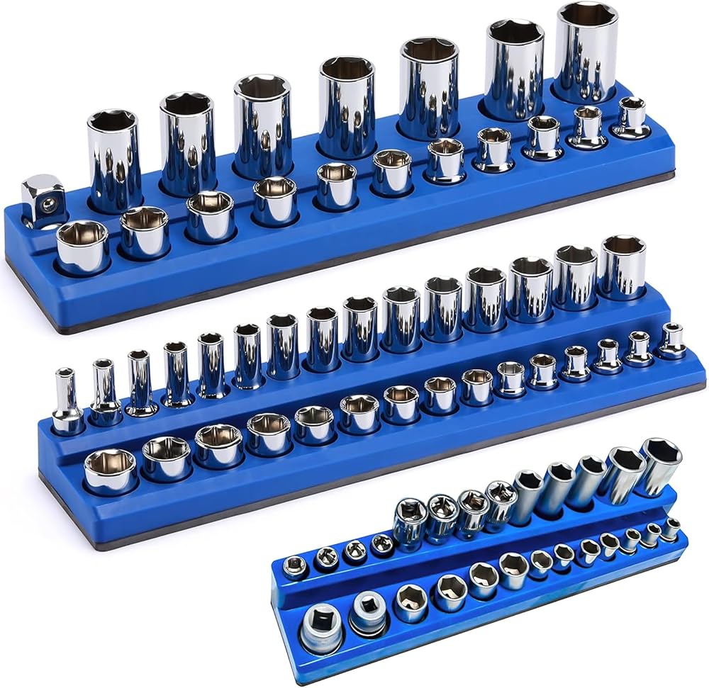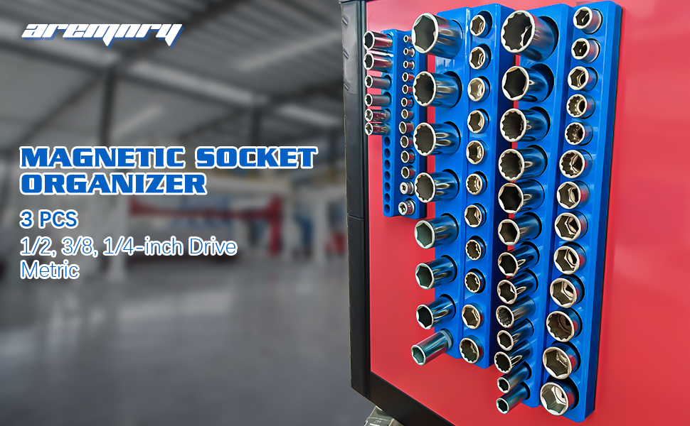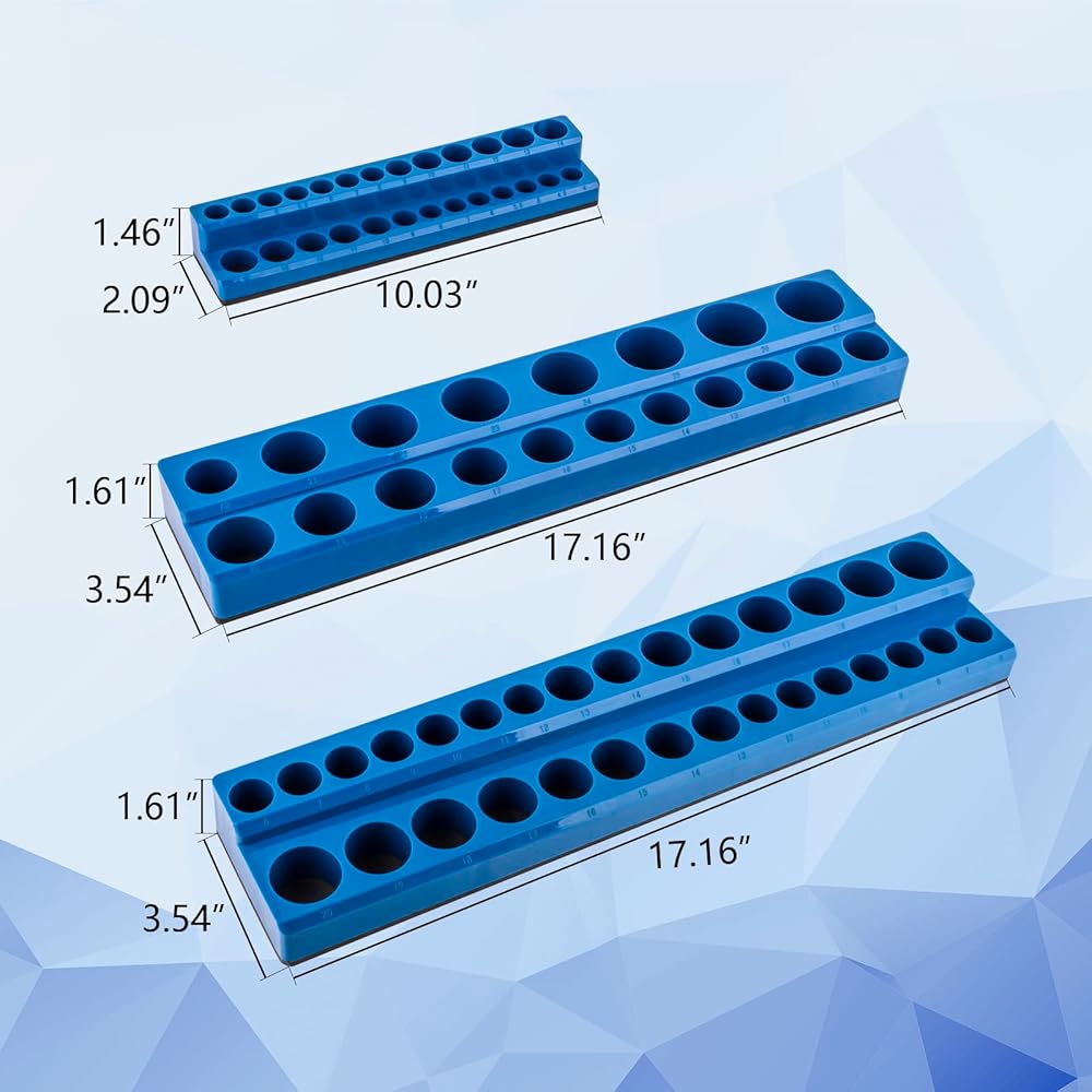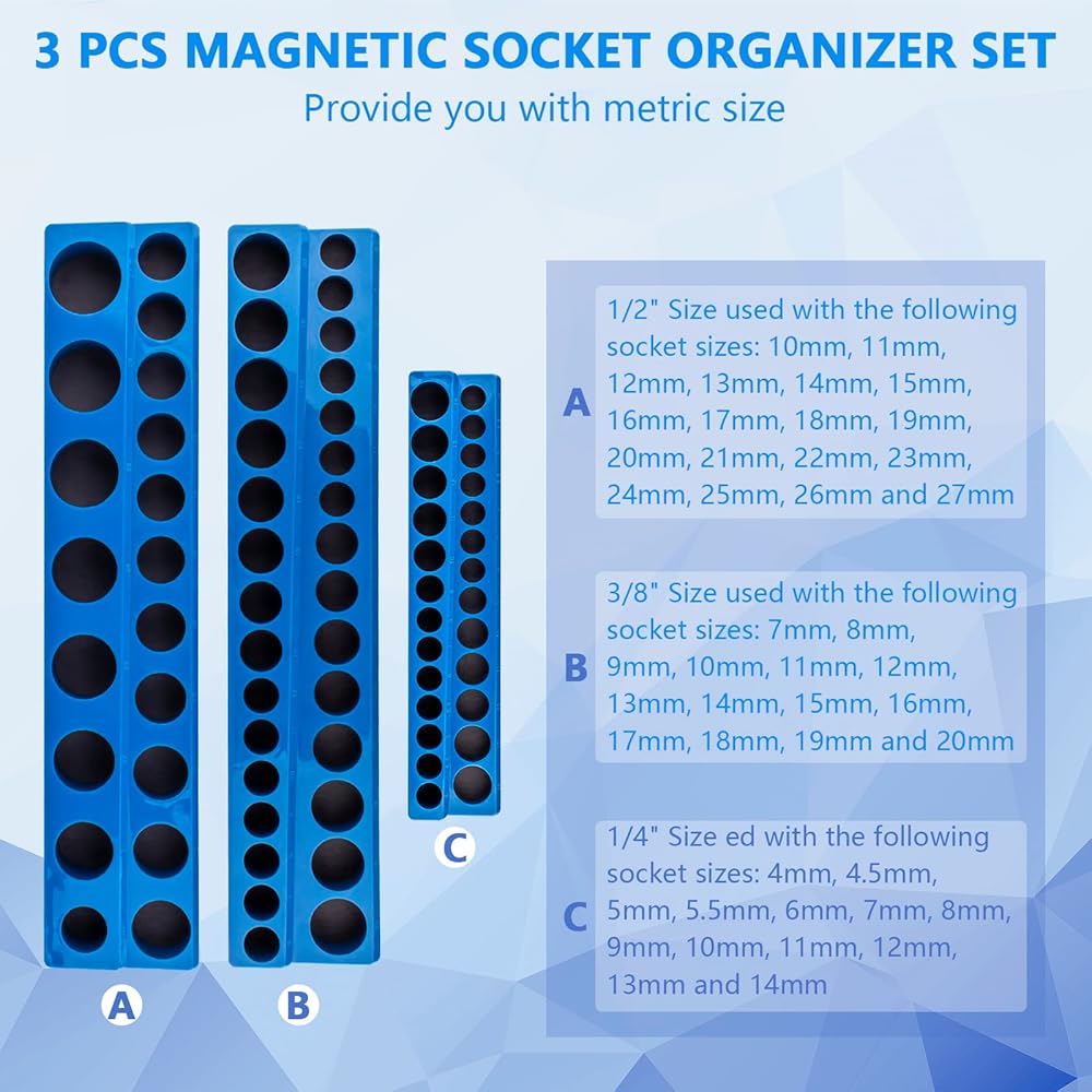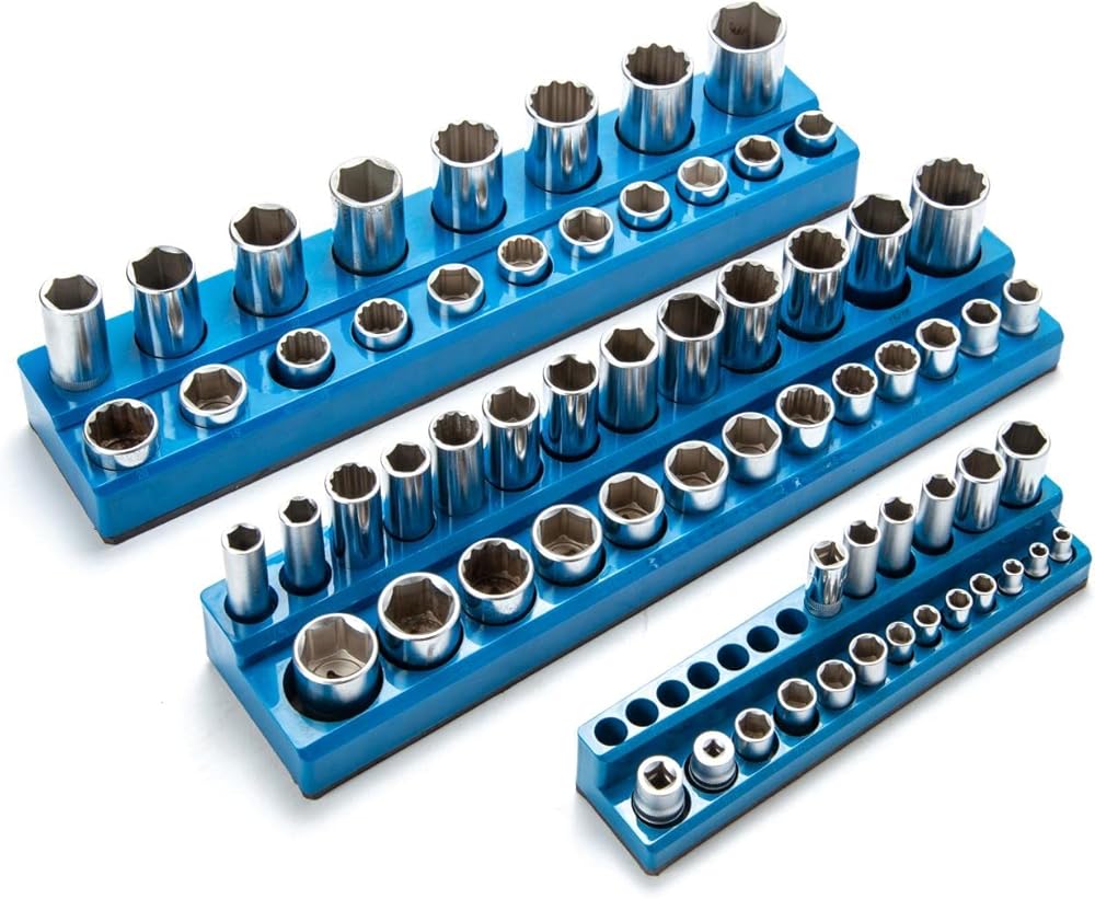 مجموعة منظم المقبس المغناطيسي ذات السعة الكبيرة: يمكن لمنظمات المقبس المغناطيسي هذه تخزين ما يصل إلى 75 مقبسًا متريًا. تشتمل المجموعة على ثلاثة منظمات مقابس مغناطيسية مترية باللون الأزرق لمحركات الأقراص مقاس 1/4 بوصة و3/8 بوصة و1/2 بوصة. وهي تجمع أوعية مترية ولكن ليس لمقابس الصدمات. نصيحة: لا يتم تضمين المقابس مع الحوامل.