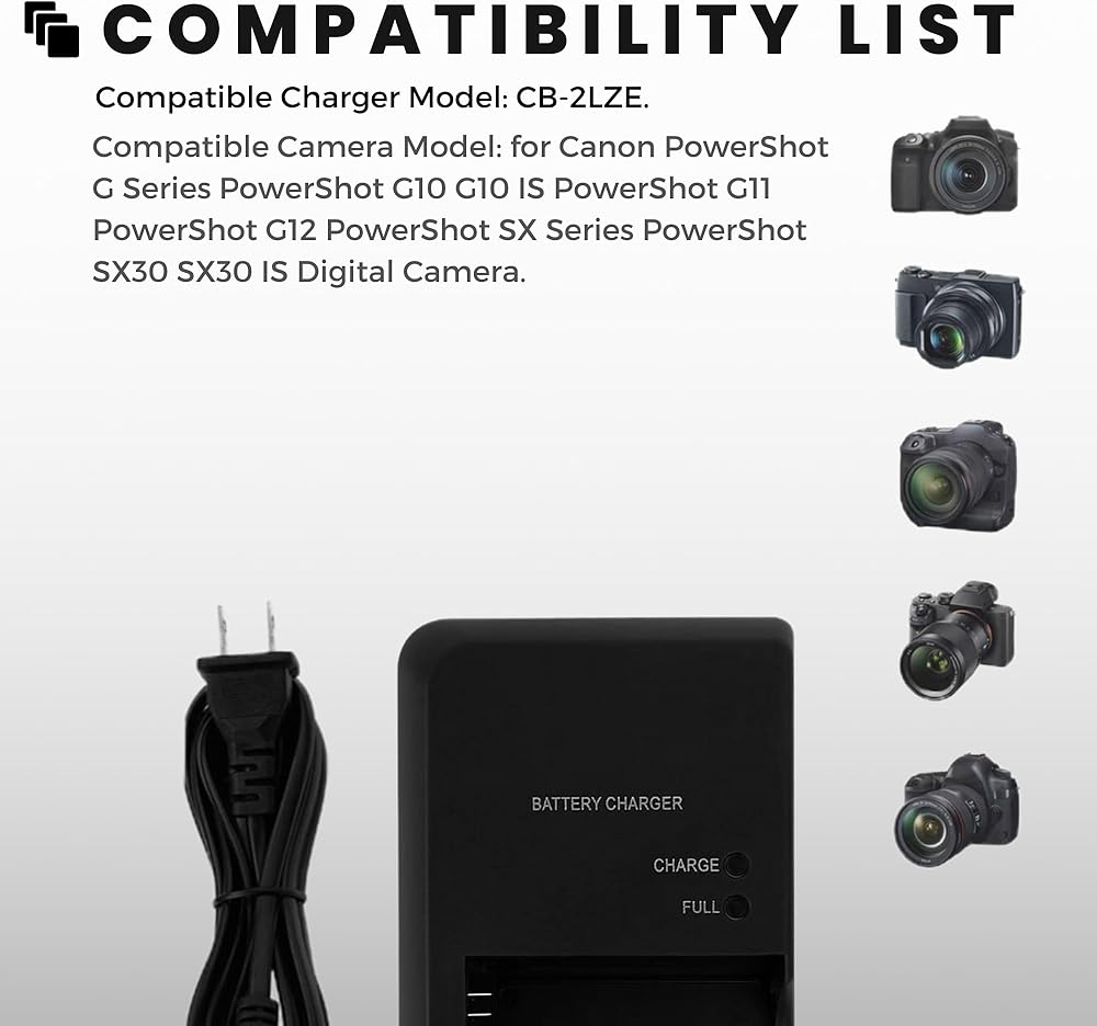 B-2LZE CB-2LZ Quick Charger for Canon: NB-7L NB-7LH 3154B001 AP065G2Uz Battery Compatible for PowerShot G Series PowerShot G10, G11, G12, SX30 IS, PC1305, PC1428, PC1560, PC1564