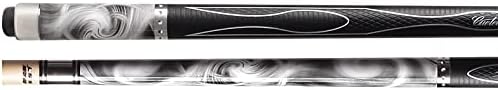 Gray, silver. and white swirl design on both the forearm and butt sleeve. This cue has a black rubberized PU sport grip with silver trim flanked by fancy dimpled polished chrome rings and polished chrome butt cap.