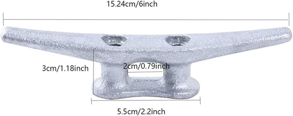 " Boat Cleat 6 inch(150mm),base measures 2 inch (50mm)by 0.75 inch(22mm); Mounting holes 1.25 inch(31mm) center to center; Horn height 1.25 inch(31mm)
