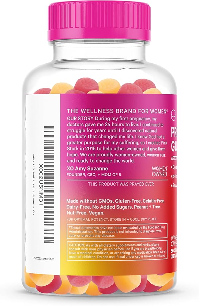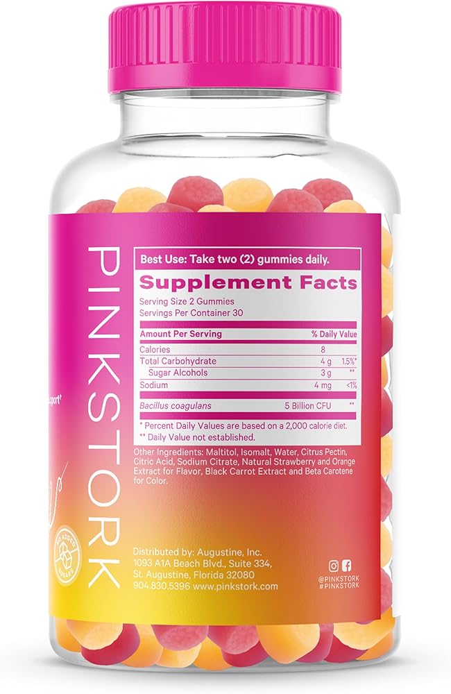 صمغ بروبيوتيك بينك ستورك للحمل وبعد الولادة - غثيان الصباح، الإمساك، توازن الرقم الهيدروجيني، صحة الأمعاء ودعم المناعة - البروبيوتيك للنساء - 60 خالية من السكر، نباتي، 5 مليار وحدة تشكيل مستعمرة