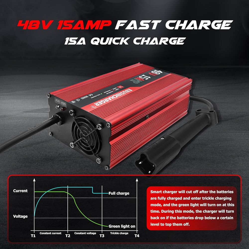 • 🚀【شحن سريع】: يمكن لشاحن عربة الجولف الذكي بقدرة 48 فولت 15 أمبير شحن عربة الجولف الخاصة بك بالكامل خلال 6-8 ساعات. يشحن أسرع 3-4 مرات من شاحن 5 أمبير، مما يوفر لك الوقت! ملاحظة: يعتمد وقت الشحن على سعة بطارية الرصاص الحمضية.