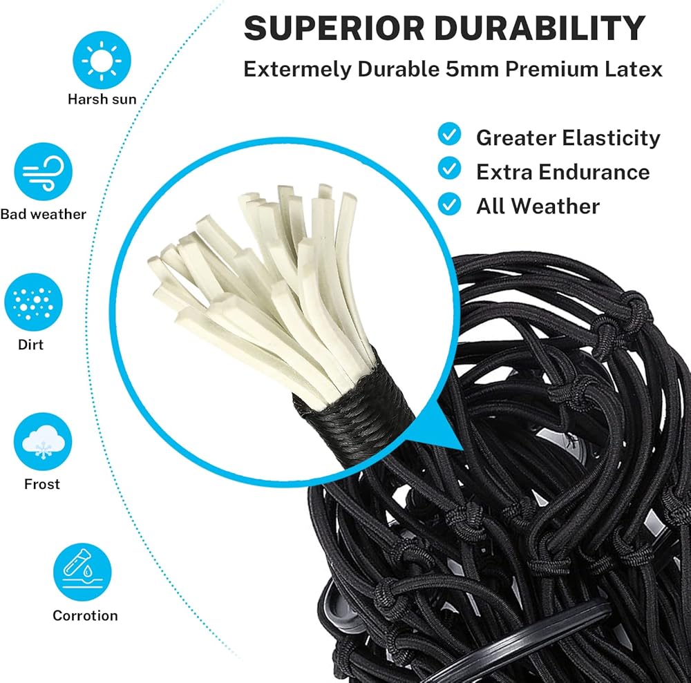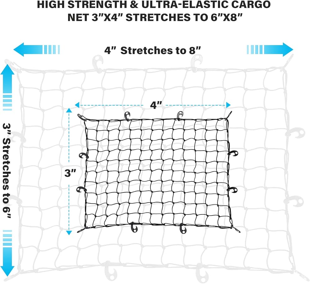 🚗 【اعتمادية صلبة وقابلة للتمدد】 يمكن أن تمتد شبكة البضائع المطاطية مقاس 3 × 4 بوصة إلى 6 × 8 بوصة. بالمقارنة مع الشبكات الشبكية الأخرى مقاس 4 × 4 بوصة، فإن شبكة شحن الشاحنة المصممة بمربعات شبكية ضيقة مقاس 3 × 3 بوصة تمنع العناصر الصغيرة من السقوط وتوفر المزيد من القوة لحماية عناصر البضائع الأكبر أثناء الركوب.