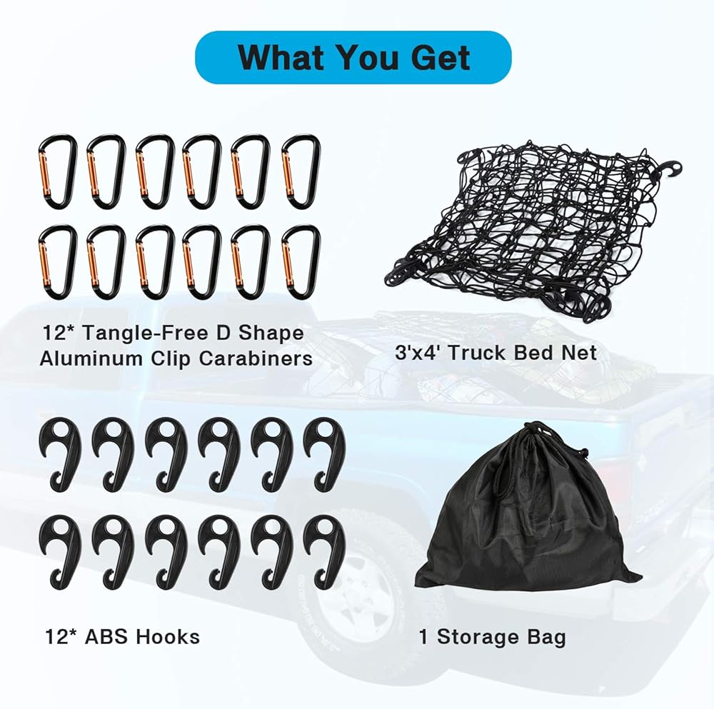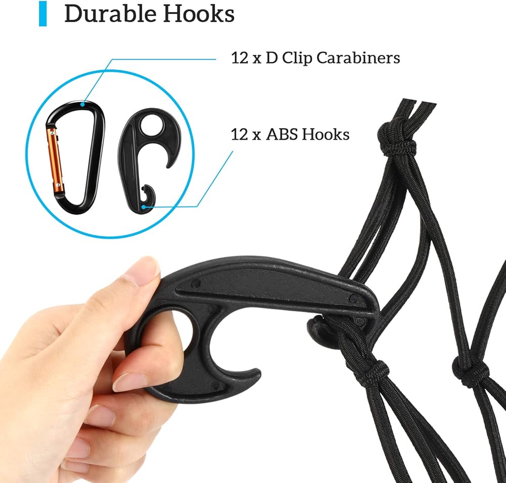 🚗【المزيد من الملحقات للإعداد الفوري】 يأتي مع 12 حلقة تسلق بمشبك من الألومنيوم على شكل حرف D و12 خطافًا من مادة ABS لتتمكن من ربط الأحمال بإحكام، وتوفير تجربة خالية من التشابك حتى تتمكن من إدخال شبكة الناقل داخل وخارج التخزين بسرعة وبشكل مريح.