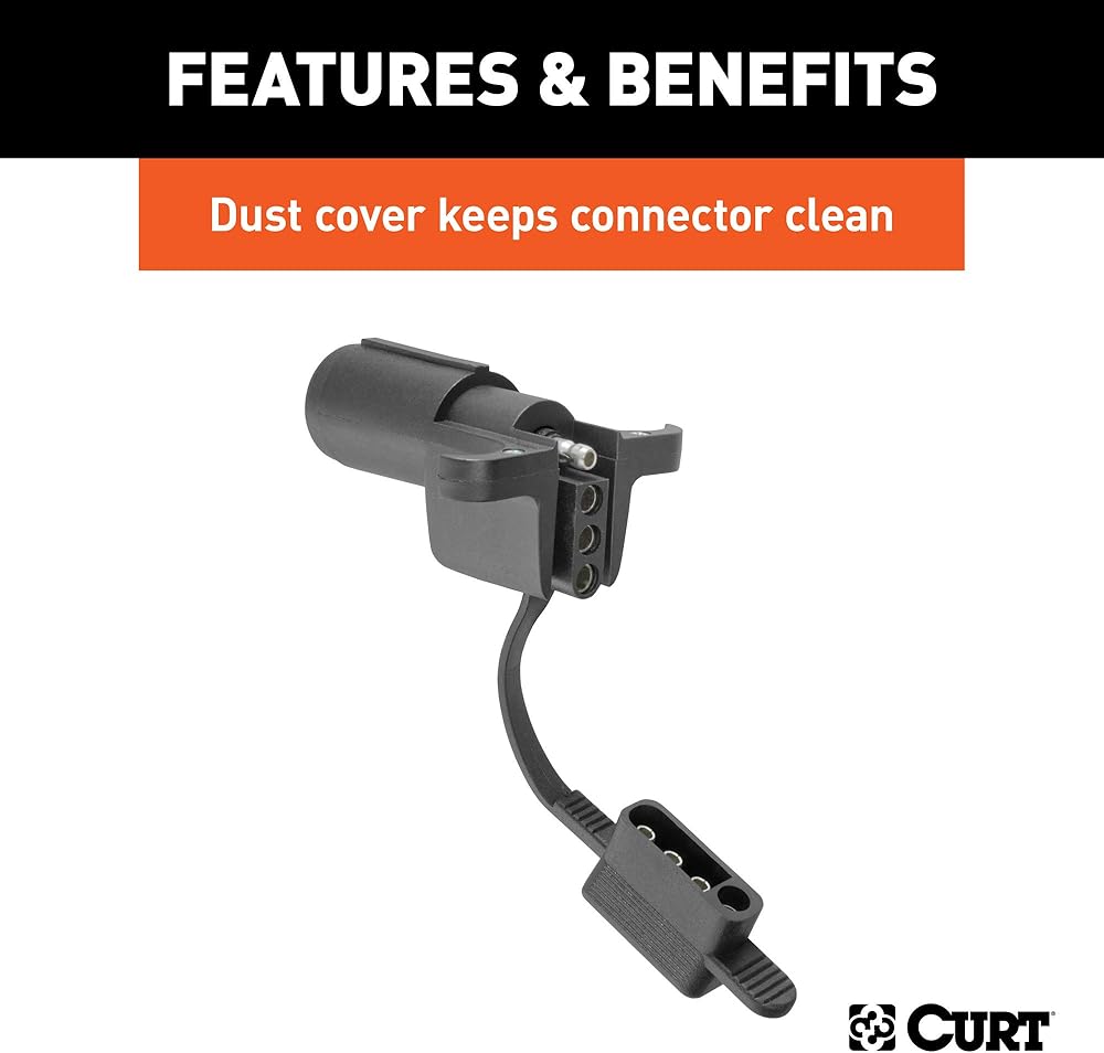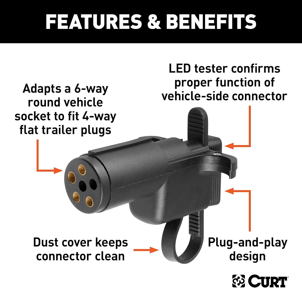 There are several different types of connectors used to supply power from a tow vehicle's electrical system to a trailer's wiring system. Some trailers only need the bare essentials -- running lights, brake lights and turn signals -- while others require a connection for reverse lights, electric brakes and auxiliary power. With connectors ranging from simple to complex, it may be the case that the connection between your vehicle and your trailer is not a perfect match. For example, your truck may be equipped with a 6-way round socket, but your trailer may have a 4-way flat plug. For this very common problem, CURT offers a quick and simple solution in the form of an electrical adapter. An adapter is an electrical device that allows a connection to be made between a mismatched trailer plug and vehicle socket. It easily plugs in your vehicle's electrical socket and usually requires no additional wiring. CURT offers an array of adapters to accommodate most types of plugs and sockets, including 4-way flat, 4-way round, 5-way flat, 6-way round, 7-way RV blades and more. This electrical adapter is designed to adapt a 6-way round vehicle socket to fit a 4-way flat trailer plug. It features quality plastic construction, requires no splicing and comes with an LED connector tester dust cover. Not only does this dust cover protect the socket from dirt, water and road grime, but it also allows you to test your vehicle-side wiring connector to ensure your electrical systems are functioning properly. All CURT wiring and electrical products come with a one-year limited warranty to give you the assurance you need to tow with confidence.