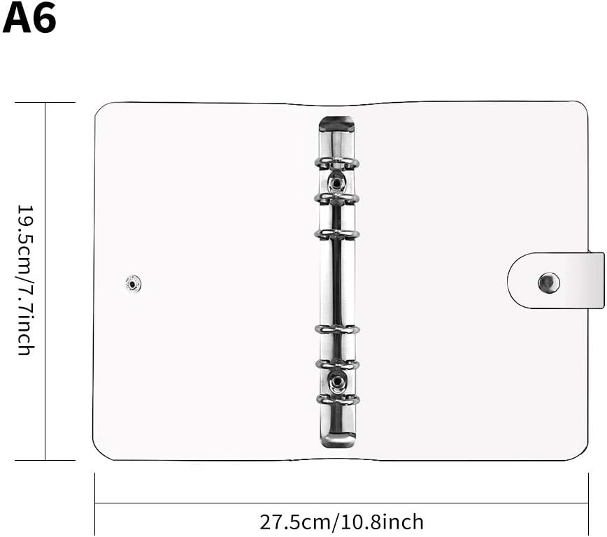 الحجم: مقاس A6، 7.68 بوصة × 5.24 بوصة/195 مم × 133 مم، 6 فتحات قياسية 0.8 بوصة/20 مم، حلقة دائرية للقطر الداخلي، الورق الداخلي غير متضمن