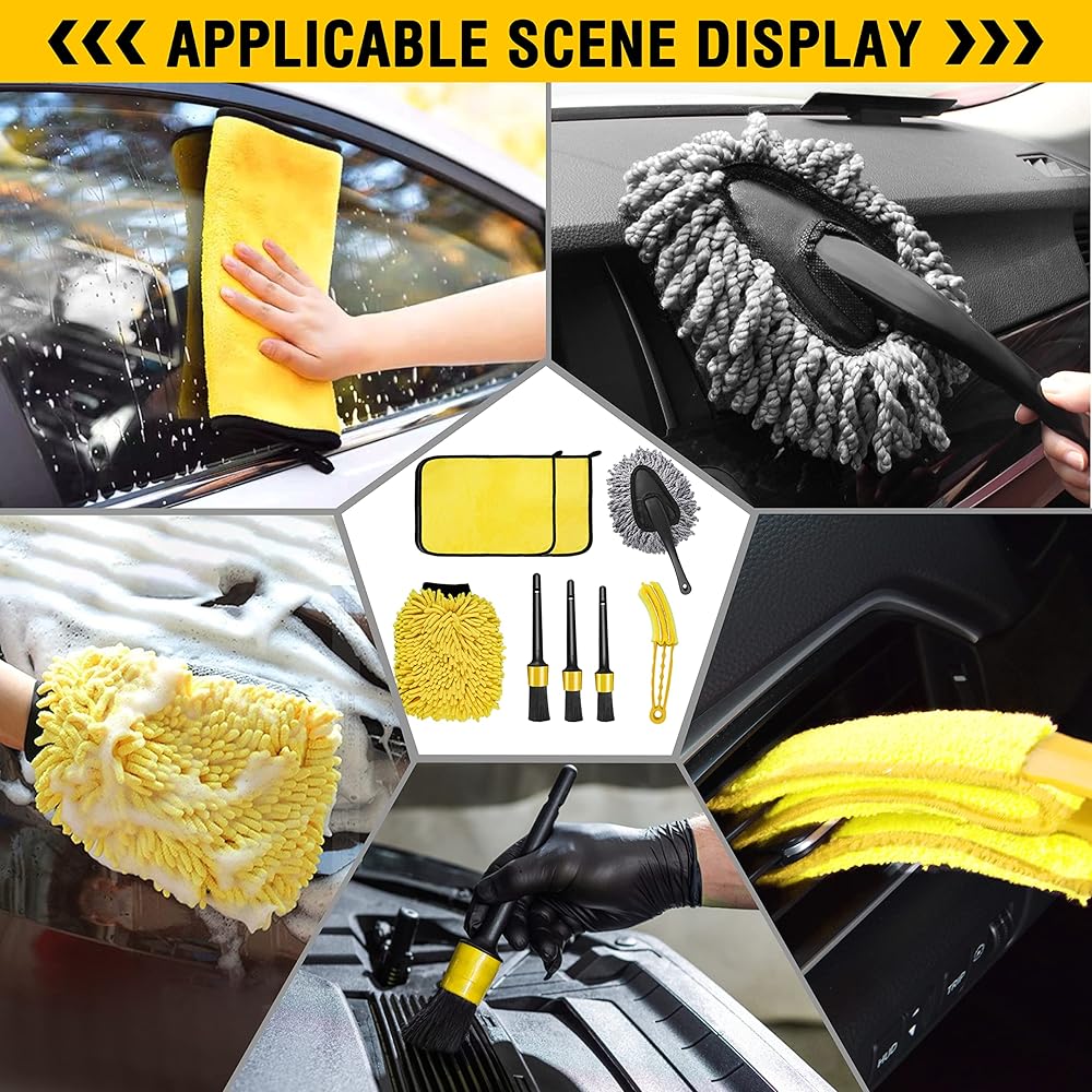 【أدوات عالية الجودة】: قفازات غسيل السيارات ومناشف التنظيف مصنوعة من مواد ناعمة ومتينة خالية من الوبر والخدوش والدوامات. لن يضر السيارة عند التنظيف. 3 أحجام مختلفة من فرش تفاصيل السيارة يمكن أن تصل إلى الأماكن الضيقة بسهولة. الشعيرات قوية وناعمة ولن تضر الأسطح الحساسة. فرشاة منفضة غبار السيارة من الألياف الدقيقة صغيرة الحجم وخفيفة الوزن وترفع الغبار. فرشاة تنفيس السيارة ناعمة ومصممة هندسيًا لسهولة التعامل مع فتحات السيارة وتنظيفها بالفرشاة.