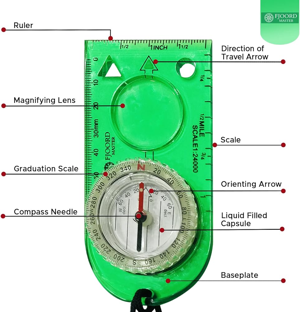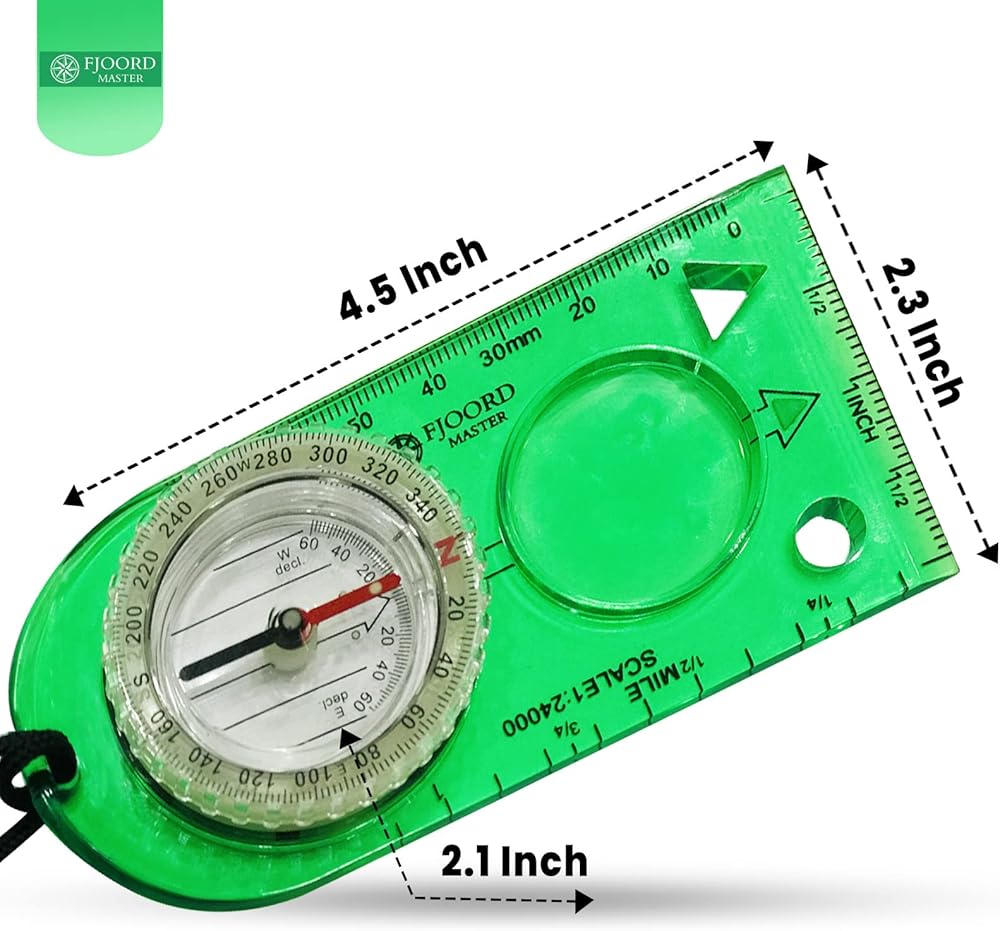 VERSATILITY: With its acrylic baseplate, azimuth bearing, and 360-degree rotating bezel, this magnet compass is designed for use in the field. Using this device will put you on the right path since the liquid-filled capsule's (bubble-free) movement enables the needle to swing freely and point north. In order to read and navigate on a map, utilize the magnifying glass. 1:24000 compass ruler is also included for locating routes