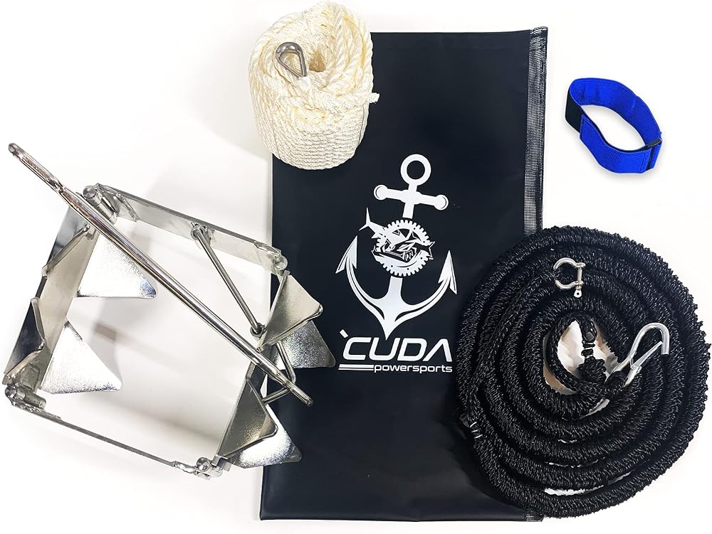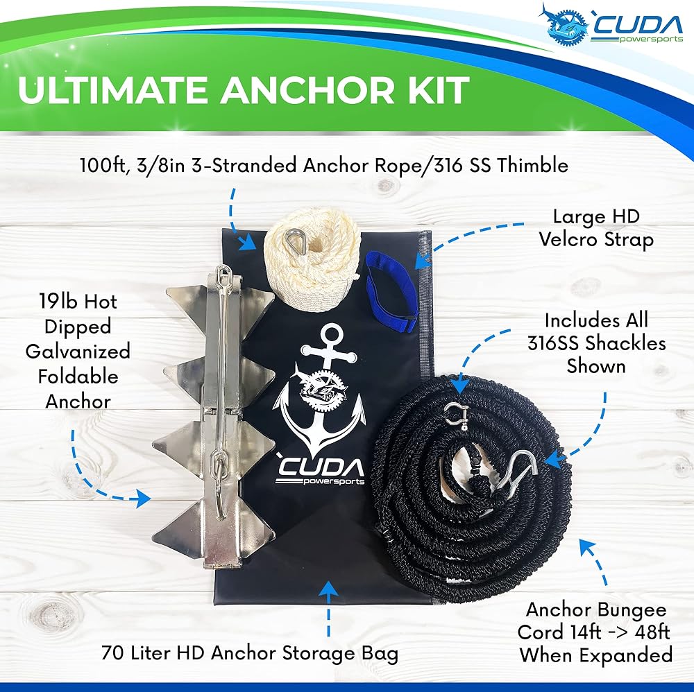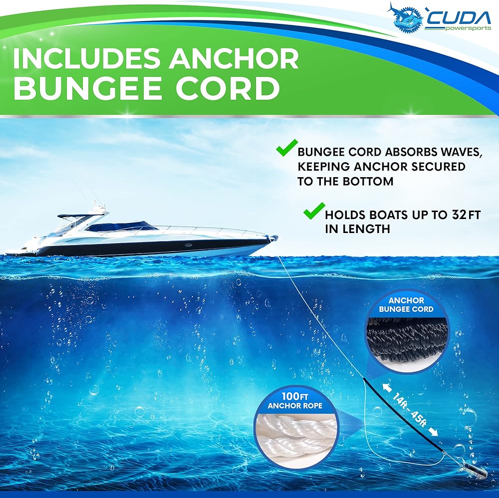 مجموعة مصممة للحمل - تصميم مرساة صندوقي فائق، وزن المرساة وحبل البنجي يحافظ على قوارب التزلج والقوارب العائمة في مكانها مقاس 32 بوصة وأكبر. يمتص الحبل المطاطي الموجات المارة/الاستيقاظ مما يحافظ على مرساة القارب في مكانها.