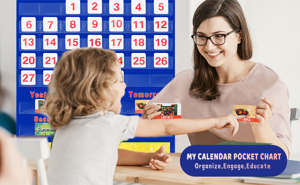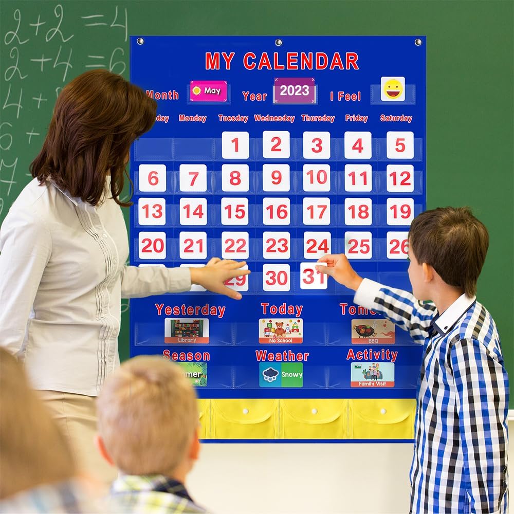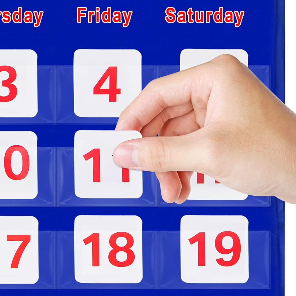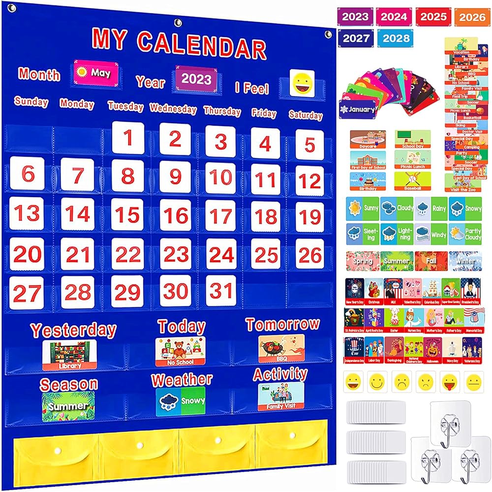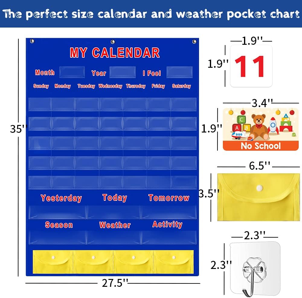 مخطط جيب للتقويم والطقس لتعلم الأطفال، كبير 35 بوصة × 27.5 بوصة، مخطط جيب لتقويم التعليم المنزلي مع 156 بطاقة، تقويم شهري لمستلزمات الفصول الدراسية في المدرسة المنزلية ورياض الأطفال