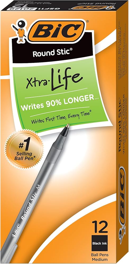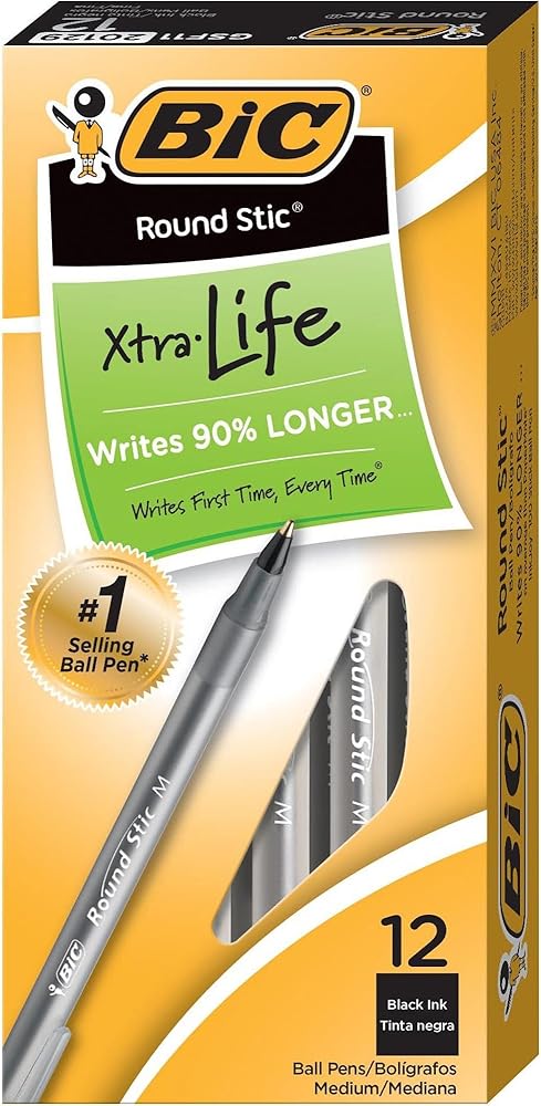 The BIC Round Stic Xtra Life Ballpoint Pen is a dependable favorite that offers performance and value, making it the #1 selling Ballpoint Pen in the US*. Great for daily use at home, school, or the office, this pen writes 90% longer on average than Papermate InkJoy 100 Ball Stick Pen.** It features a versatile 1.0mm medium point that creates vivid lines and has a reliable tungsten carbide ball point that spreads the ink smoothly and evenly, making this pen ideal for a variety of writing applications from note-taking to doodling. The flexible round barrel rests comfortably in your hand, while the translucent barrel shows the remaining ink supply, so you know when you're running low. BIC Round Stic Xtra Life Ballpoint Pens are non-refillable. *Source: The NPD Group/ Retail Tracking Service/ U.S. Actual Unit Sales (Retail & Commercial Combined)/ Jul 2016-Jun 2017 ** Paper Mate and InkJoy are trademarks of Newell or an affiliate. Newell has not sponsored or approved and is not affiliated with this BIC branded product.