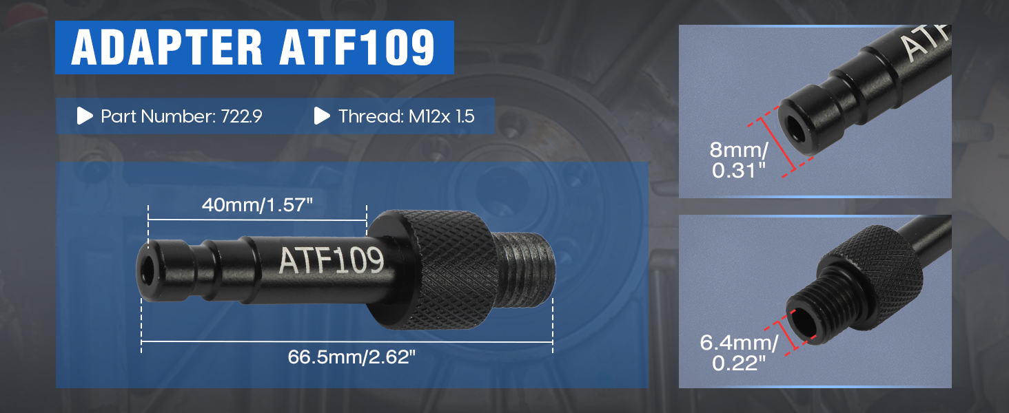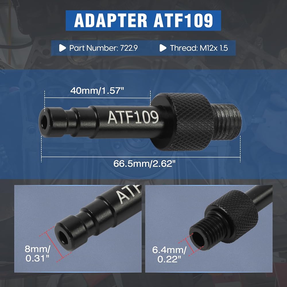 طقم تعبئة سائل ناقل الحركة مكون من 4 قطع وATF109 - مجموعة أدوات ملء سائل ناقل الحركة تأتي مع حقيبة حمل لسهولة الحمل والتخزين. تضيف هذه المجموعة المكونة من 4 قطع محول سائل ناقل الحركة (ATF109) إلى ناقل الحركة الأوتوماتيكي Mercedes-Benz 722.9. إنه بمثابة موصل لأداة حشو ATF لوعاء زيت السيارات. بالمقارنة مع المنتجات المشابهة المكونة من 3 قطع، فإن منتجاتنا أكثر ملاءمة وتوفر وقتك وأموالك.
