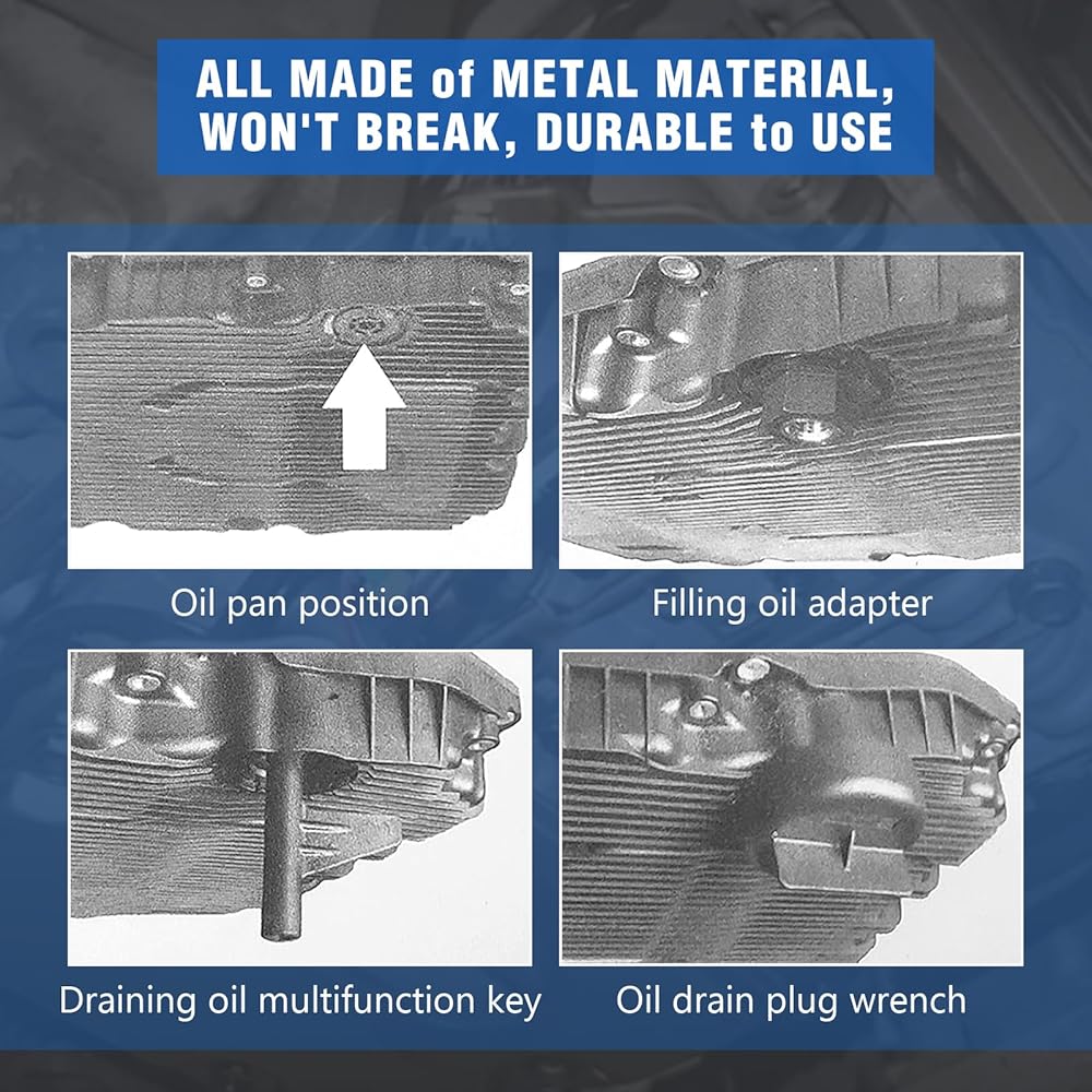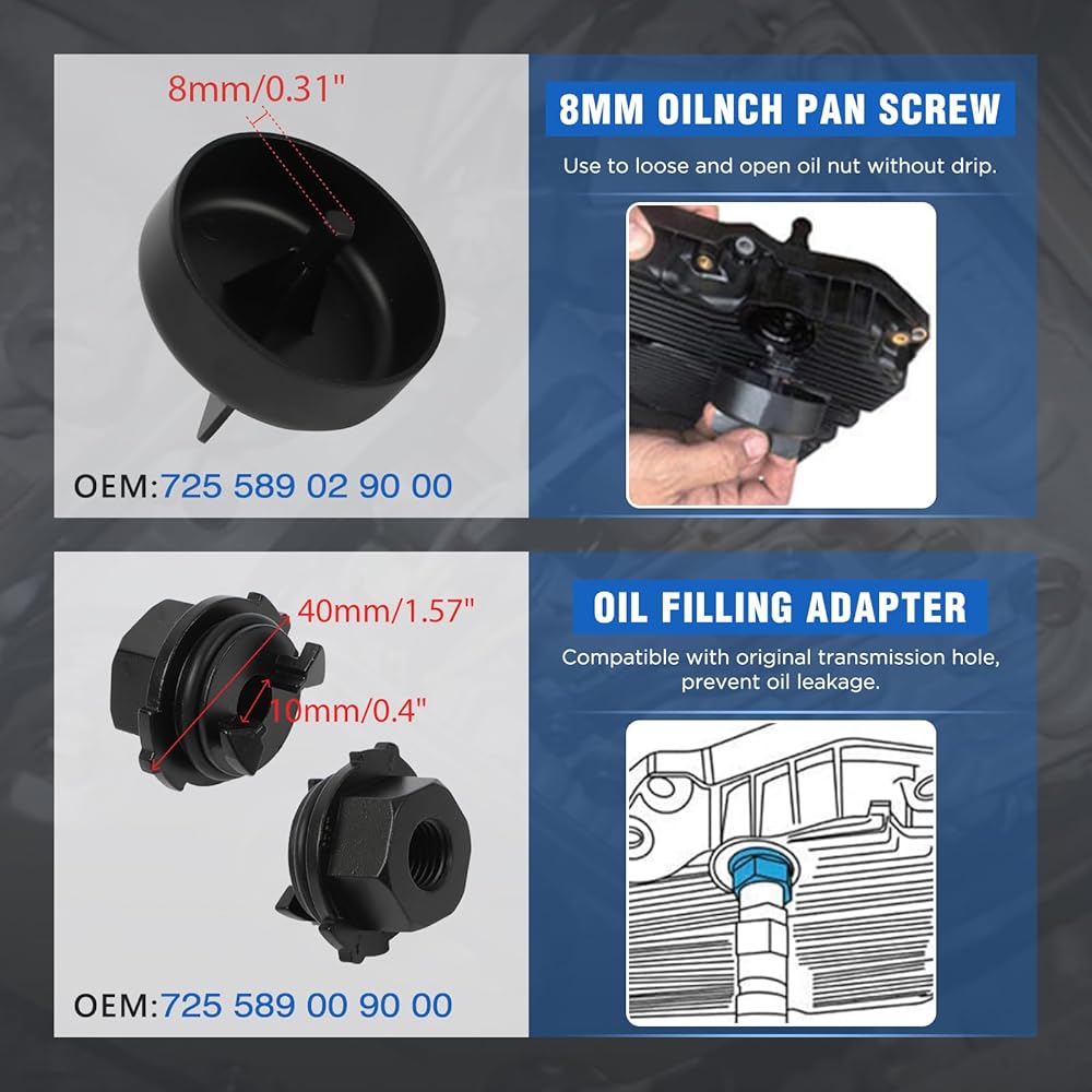 وظائف أسهل لتغيير الزيت - 4 موصلات أداة تغيير سائل ناقل الحركة المعدنية للتعبئة والتصريف وإزالة المسمار أو التثبيت تساعد السيارات على تغيير سائل ناقل الحركة الأوتوماتيكي (ATF) بسهولة. تم تصميم مجموعة حشو سائل ناقل الحركة هذه خصيصًا لاستخدامها من قبل مرسيدس بنز 725.0 9 Speed للمساعدة في تغيير الزيت.