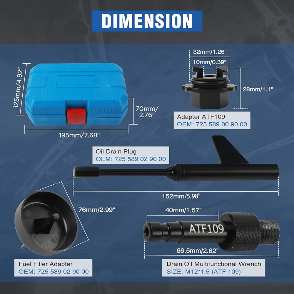 العبوة والخدمة - تتضمن العبوة: 1 × موصل خزان، 1 × مفتاح ربط خزان 8 مم، 1 × مفتاح تصريف الزيت، 1 × محول حشو ATF109 M12*1.5 وحقيبة مخصصة. إذا كان لديك أي أسئلة، يمكنك الاتصال بخدمة العملاء لدينا. سوف نقوم بحل مشكلة الجودة بشكل فعال خلال 24 ساعة. رضا العملاء هو على رأس أولوياتنا.